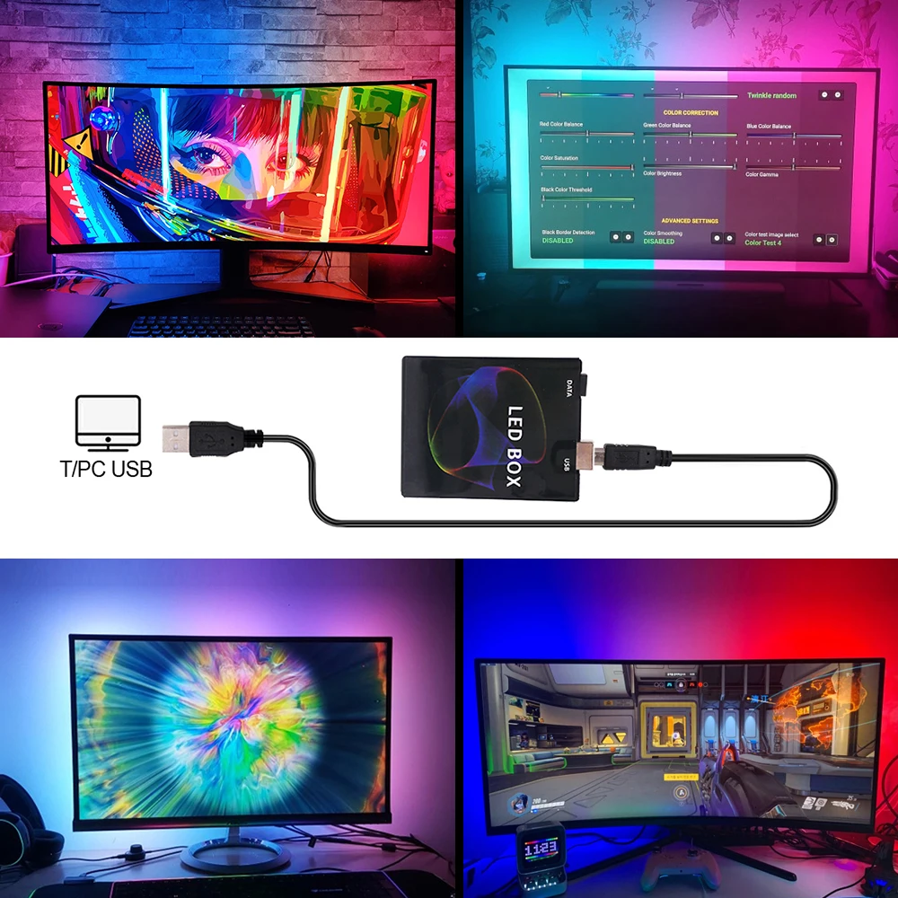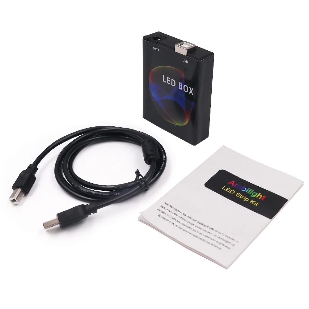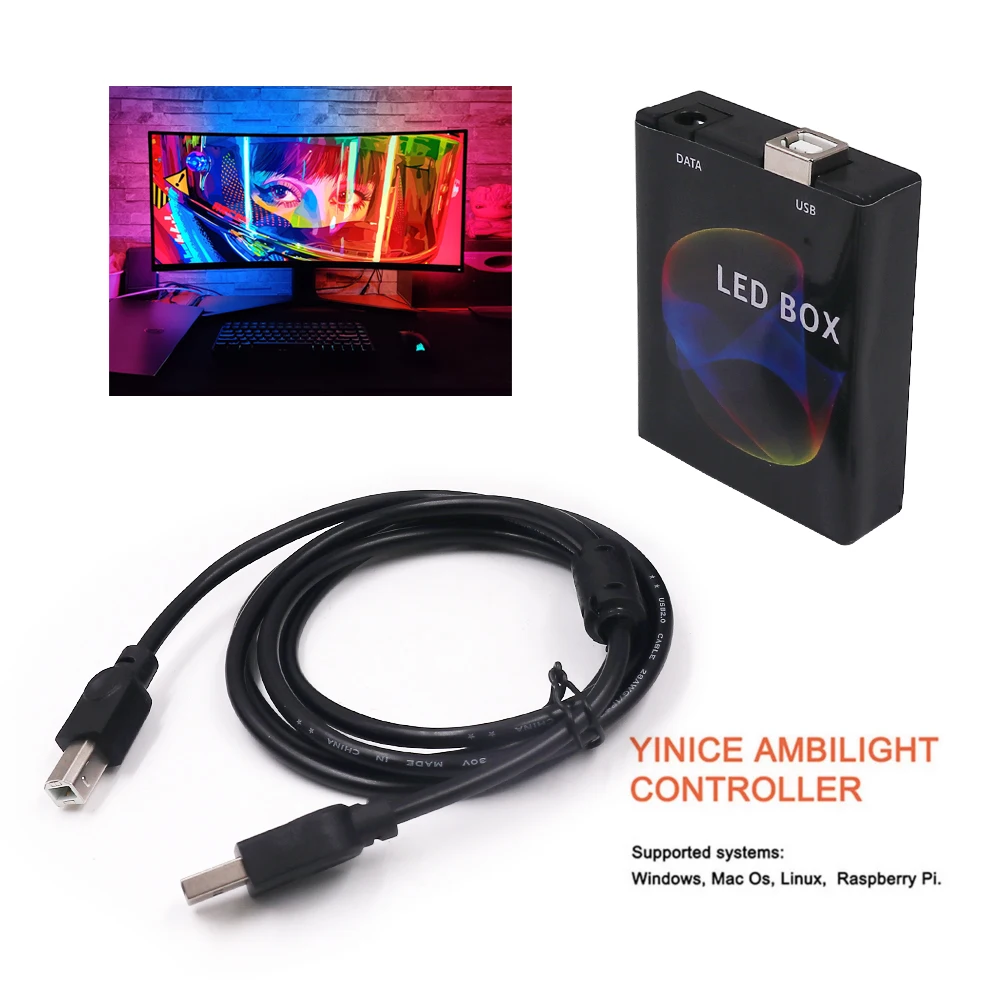 Применяется к светодиодной ленте WS2811 WS2812B SK6812 RGBКонтроллер окружающей среды + USB-кабель(Без полосы, без источника питания)Входное напряжение: 5 ВДиапазон использования: фон ТВЭтот продукт представляет собой только контроллер, можно использовать только светодиодную ленту WS2812B RGB, источник питания и программное обеспечение.Этот Ambibox добавляет эффекты внешней подсветки компьютеру или ноутбуку. Набор Ambibox динамически настраивает такие элементы, как цвет и яркость, чтобы создать более захватывающий мультимедийный опыт.