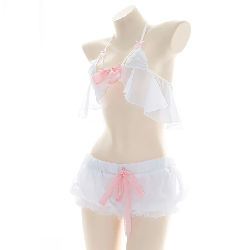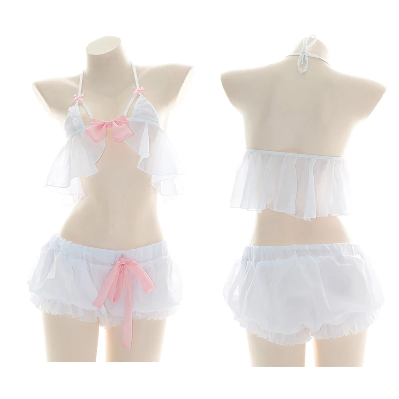 Шифоновая ночная рубашка для девочек Lolita, с оборками, сексуальное бикини, с лямкой на шее, пижамы с бантиком, с аниме, домашний костюм косплей, шаровары, шорты, нижнее белье