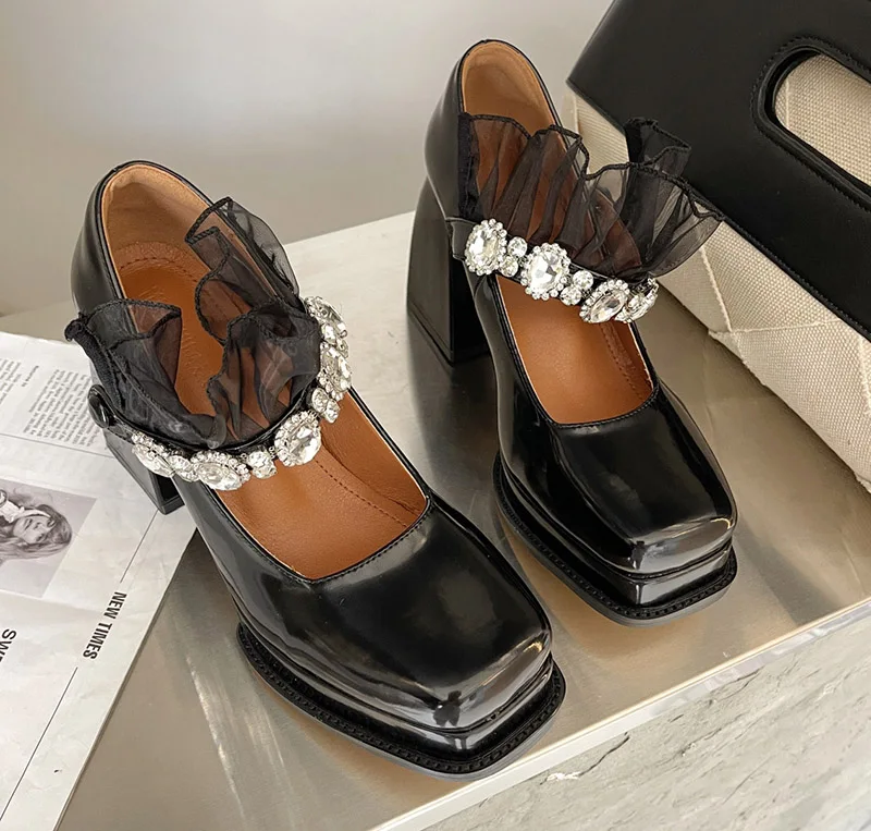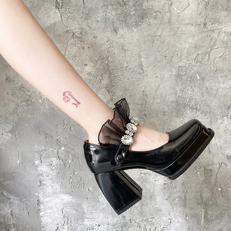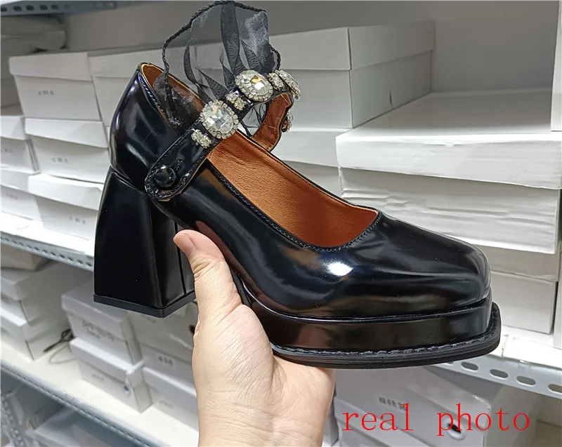 Туфли-лодочки женские на массивной платформе, квадратный каблук, квадратный носок, пряжка, на ремешке, стразы
