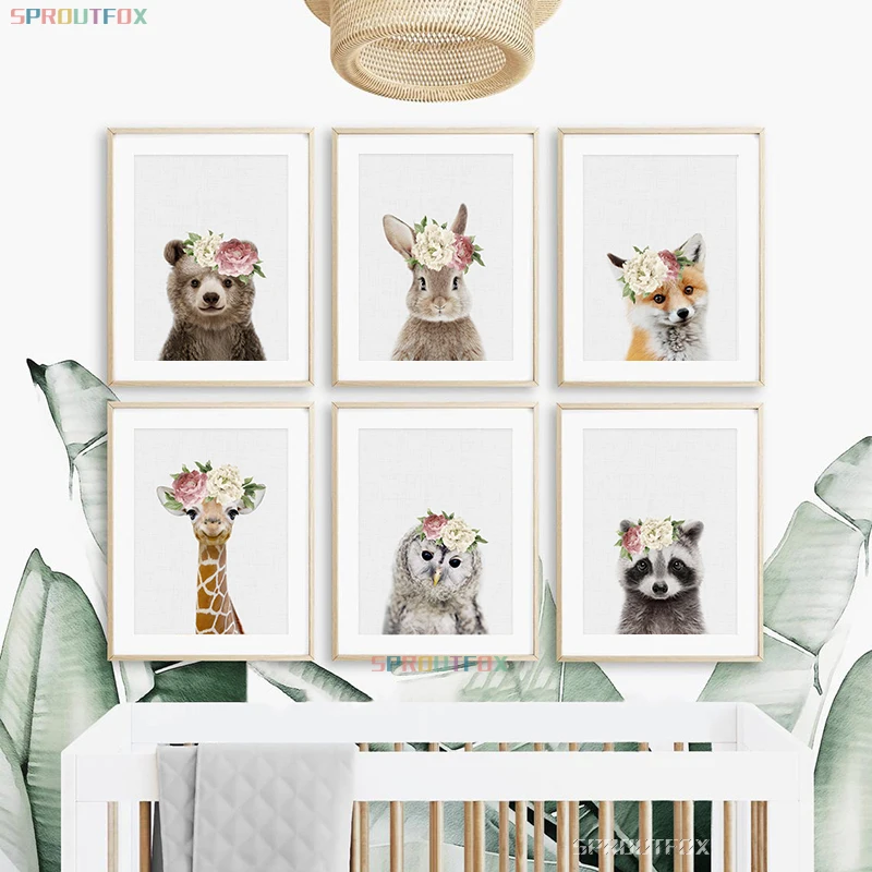 Постер с изображением животных, цветов, медведя, кролика, лисы, Картина на холсте, детский подарок, Настенная картина для интерьера, декор для детской комнаты