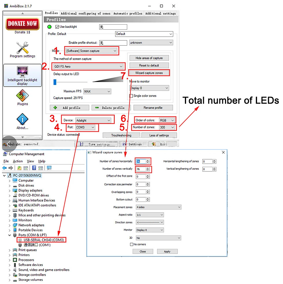 Шаг 1: Установите светодиодный светильник на вашем ПК. (Для получения подробной информации обратитесь к видео)Шаг 2: настройка программного обеспечения Ambibox Capture.2,1. Программное обеспечение Ambibox (Shareware); Ссылка для скачивания: https://drive.google.com/file/d/1aR1z_wcBfGw2ixTBYI01CshD_q8RMxxc/view?usp=sharing2,2. Запуск программного обеспечения Ambibox, при установке, рекомендуется использовать PlayClaw, я не рекомендую использовать его.2,3. Выберите устройство и установите его как «Adalight», в меню «Интеллектуальный дисплей подсветки» выберите порт и com-порт, который был обнаружен вашим устройством. Если выбрать правильно, вы можете увидеть состояние устройства: подключено, также внизу слева будет сказано, что Adalight: подключено. Если не удается найти usb-драйвер/com-порт, загрузите USB CH340: https://drive.google.com/file/d/1GS5FrjN5620I_RKJMOe5IAGNSqlke9jC/view?usp=sharing2,4. После установки вы можете выбрать «Зоны Захвата мастера», которая автоматически генерирует все Зоны Захвата для вас.Примечание: usb-порт должен быть CH340(COM *), если нет, пожалуйста, загрузите драйвер CH340:Https://drive.google.com/open?id=1GS5FrjN5620I_RKJMOe5IAGNSqlke9jC