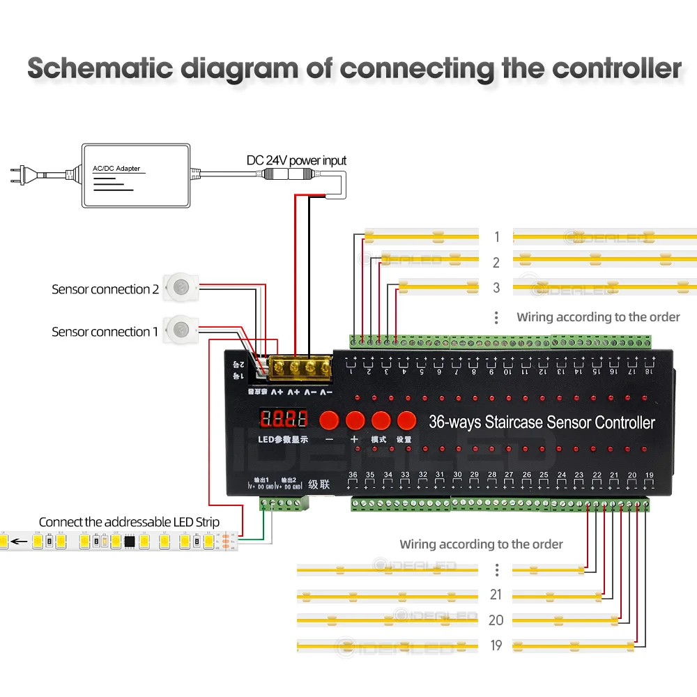 36 канальная Многофункциональный светодиодный контроллер с двумя датчики, который может управлять 2 виды светодиодный светильник, один является dreamcolor светильник, который поддерживает универсальный SPI single-проволочный Чип, такие как универсальный UCS1903, 1909, 1912, TM1812, WS2811, 16703, WS2812B, 8205, 8206 и так далее полноцветный пиксельный светодиодный светильник s, Система управления в левом нижнем углу DO1, GND, DO2, GND с 2 параллельными выходными клеммами, может быть подключена к левой и правой сторонах лестничных огней. Выходные клеммы с обеих сторон контроллера предназначены для одноцветных лент-светильник, используемых на 36 ступенях лестницы, количество полос-светильник можно отрегулировать. Настройка функции индукционного контроллера выбирается кнопками. Настройка выводится через 4-разрядный цифровой трубки с левой стороны.