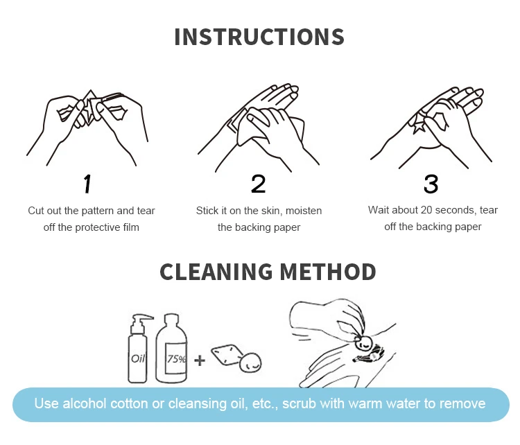Размер: 11х7, 5 см/штПосылка: 1 шт. тату-наклейкиИнструкции:1: Очистите часть тела, где должны быть сделаны татуировки наклейки, чтобы убедиться, что нет воды и масла2: Оторвите прозрачную пленку на поверхности, приклейте узорную сторону к коже, а затем смочите наклейку водой3: Нажмите и побейте около 10 секунд, пока бумага не соскальзывает, Снимите нижнюю бумагу4: вставьте успешно, используйте бумажное полотенце, чтобы впитать лишнюю воду, и нанесите немного крема для рук для достижения лучших результатов