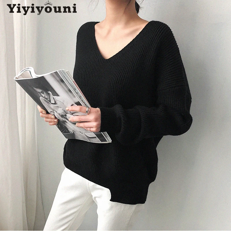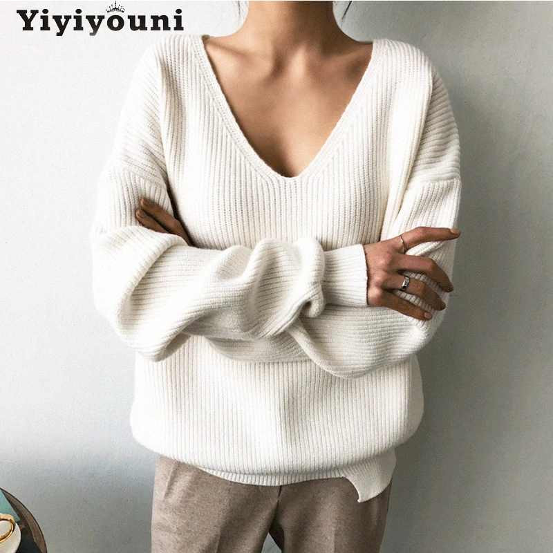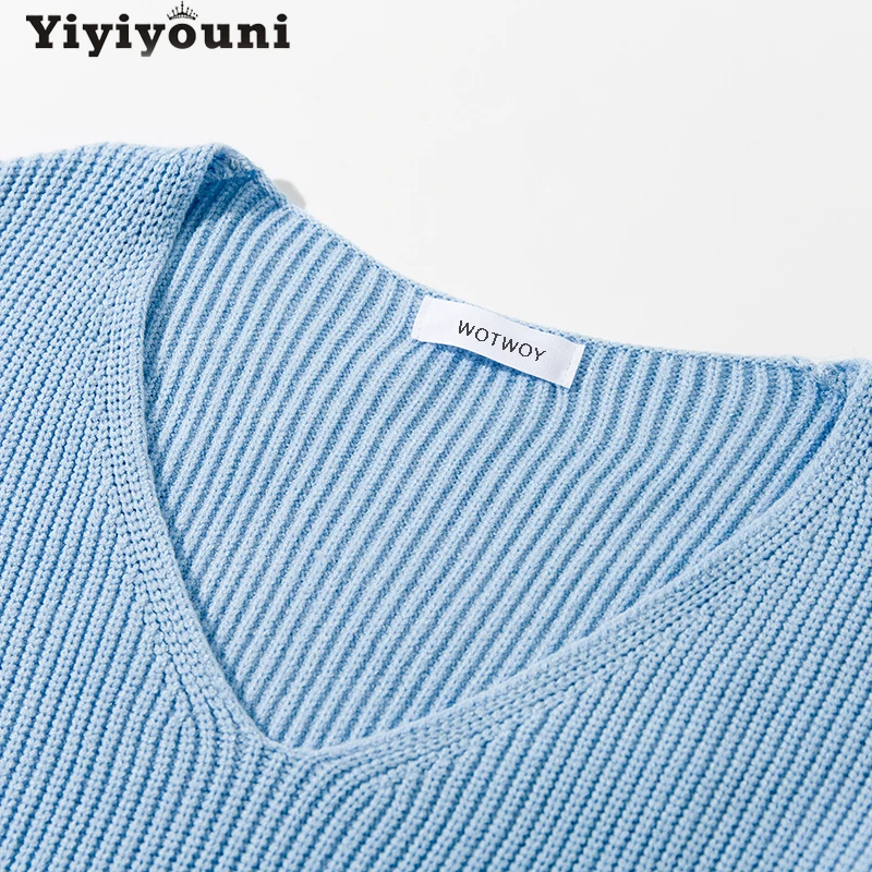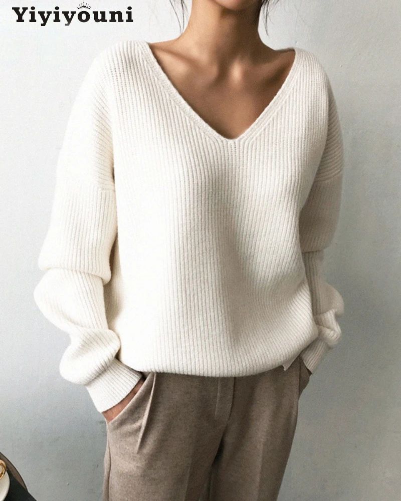 Осенне-зимние вязаные свитера большого размера Yiyiyouni с V-образным вырезом, Женские Повседневные вязаные пуловеры с длинным рукавом, Женские однотонные базовые свитера