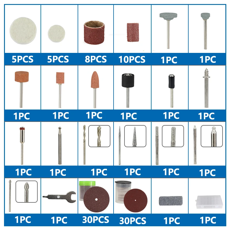 5. Эти электрические наборы для полировки имеют шлифовальную пасту, шлифовальный камень, наждачную бумагу, шлифовальный круг, полировальную пасту, нейлоновую щетку, стальную проволочную щетку, сверлильные Шатуны и т. д.