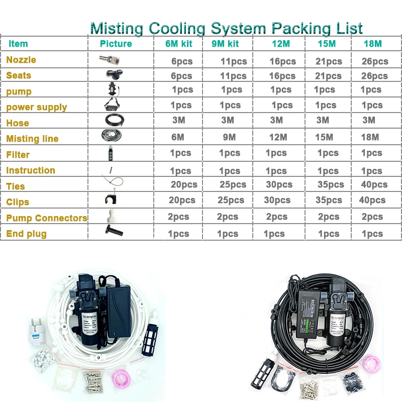 Шаги установки:1. Рекомендуется установить система распыления на высоте 2,5 м до 3 м.2. Подключите впускную водопроводную трубу к фильтру и поместите фильтр в резервуар для воды3. Подключите систему к питанию для очистки системы в течение 1 минуты для удаления примесей.4. Нажимное сопло на Тройник, за исключением одного сопла в конце.5. Включите систему, чтобы очистить систему в течение 2 минут, чтобы убедиться, что система полностью очищена.6. Закройте воду и установите последнюю насадку на соединение с помощью торцевой вилки.7. Зажимы и стяжки предусмотрены для фиксации распыляющей трубы.8. Включите систему до тех пор, пока атомайзер не будет работать и наслаждаться системой охлаждения.9. Когда система распыления не используется в течение длительного времени, закройте насадку и держите ее сухой и чистой.