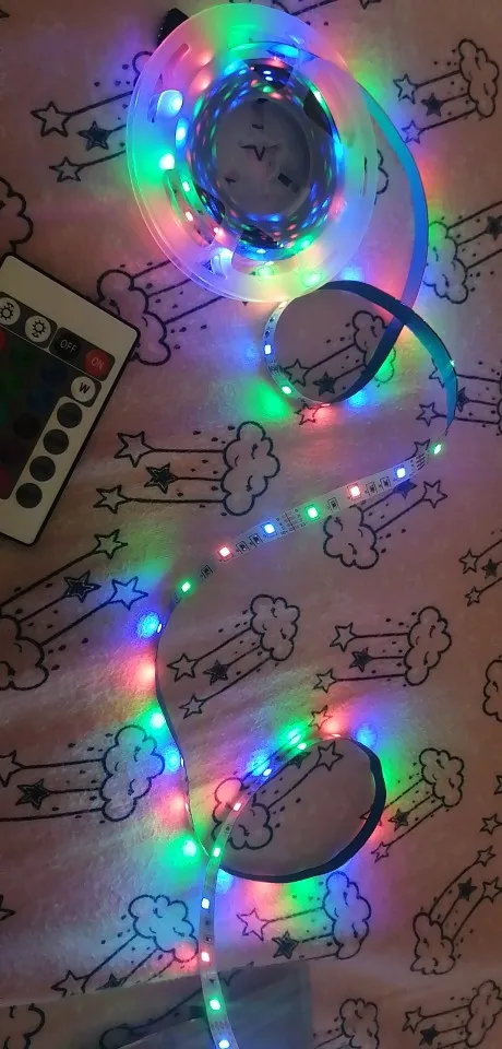 Хорошее качество. Все работает. 15 вариантов цвета, за исключением белого-хотя на пульте управления. Сам пульт дистанционного управления маленький, 5x8, невесомый, я думал, что он будет больше и тяжелее, но это как... Я сделал 3 м, липкая сторона доступна, рекомендую