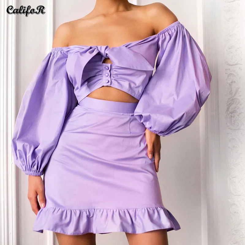 Соблазнительные комплекты из платья с вырезами, осенние женские костюмы с бантом и юбкой, однотонное милое платье с оборкой, Женский комплект
