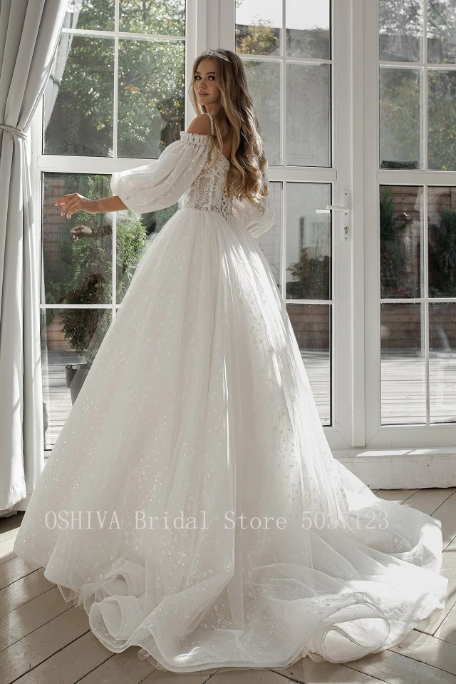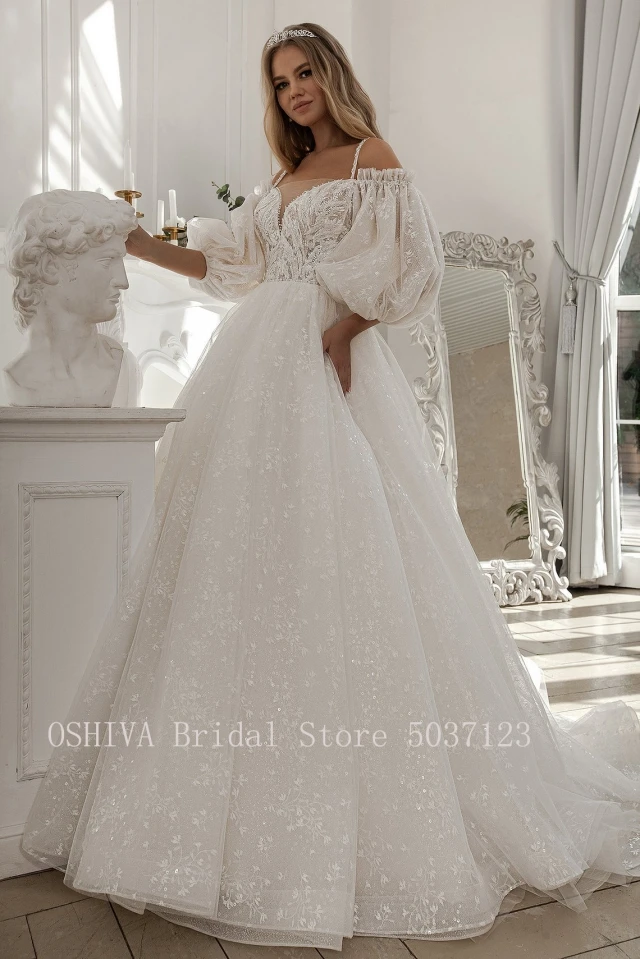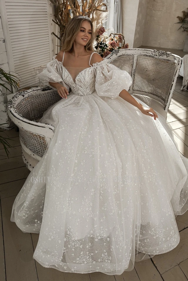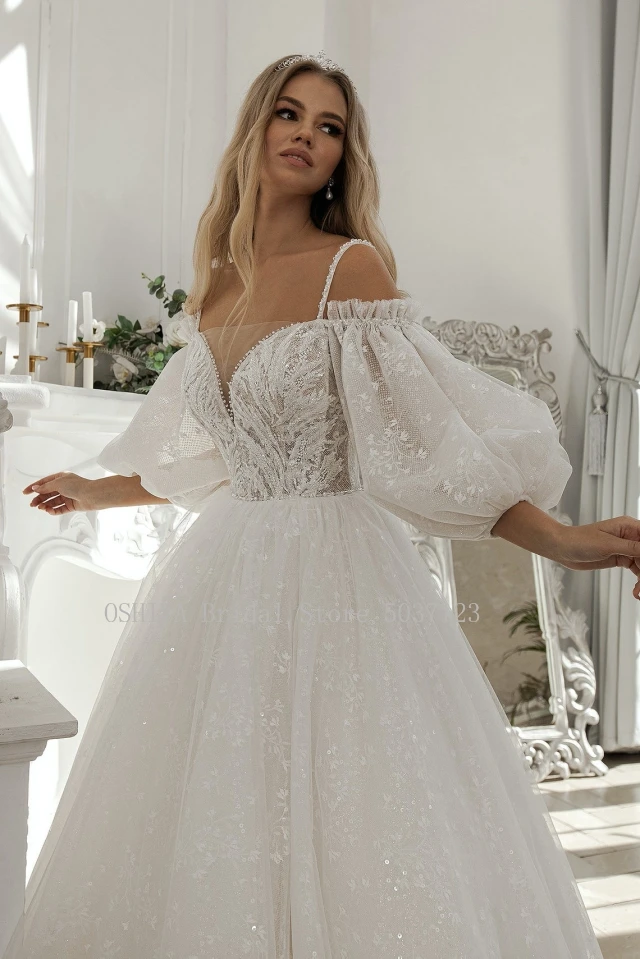 Кружевное свадебное платье принцессы с аппликацией, бальное платье с пышными рукавами, Тюлевое винтажное пляжное платье невесты со шлейфом, 2021