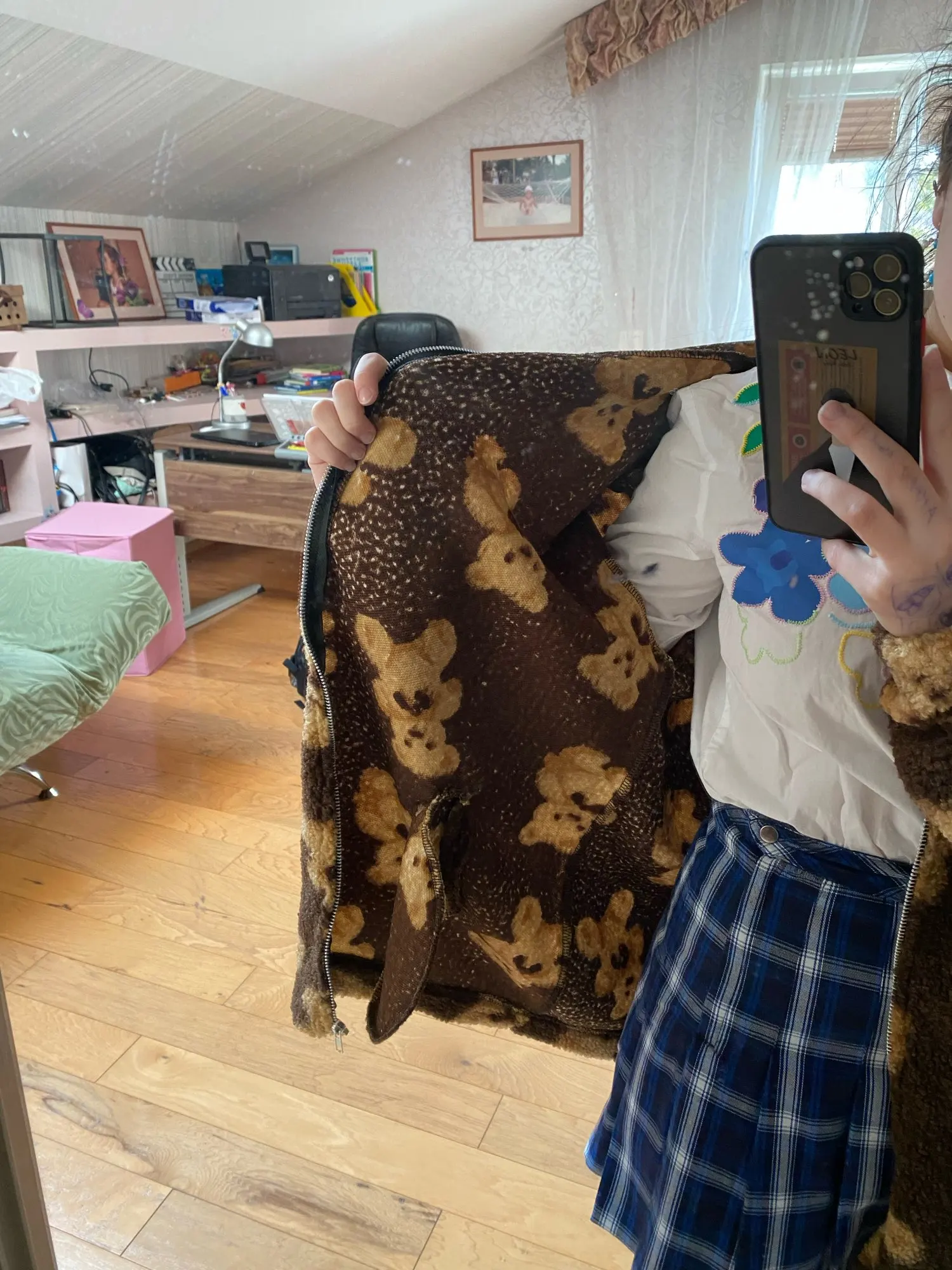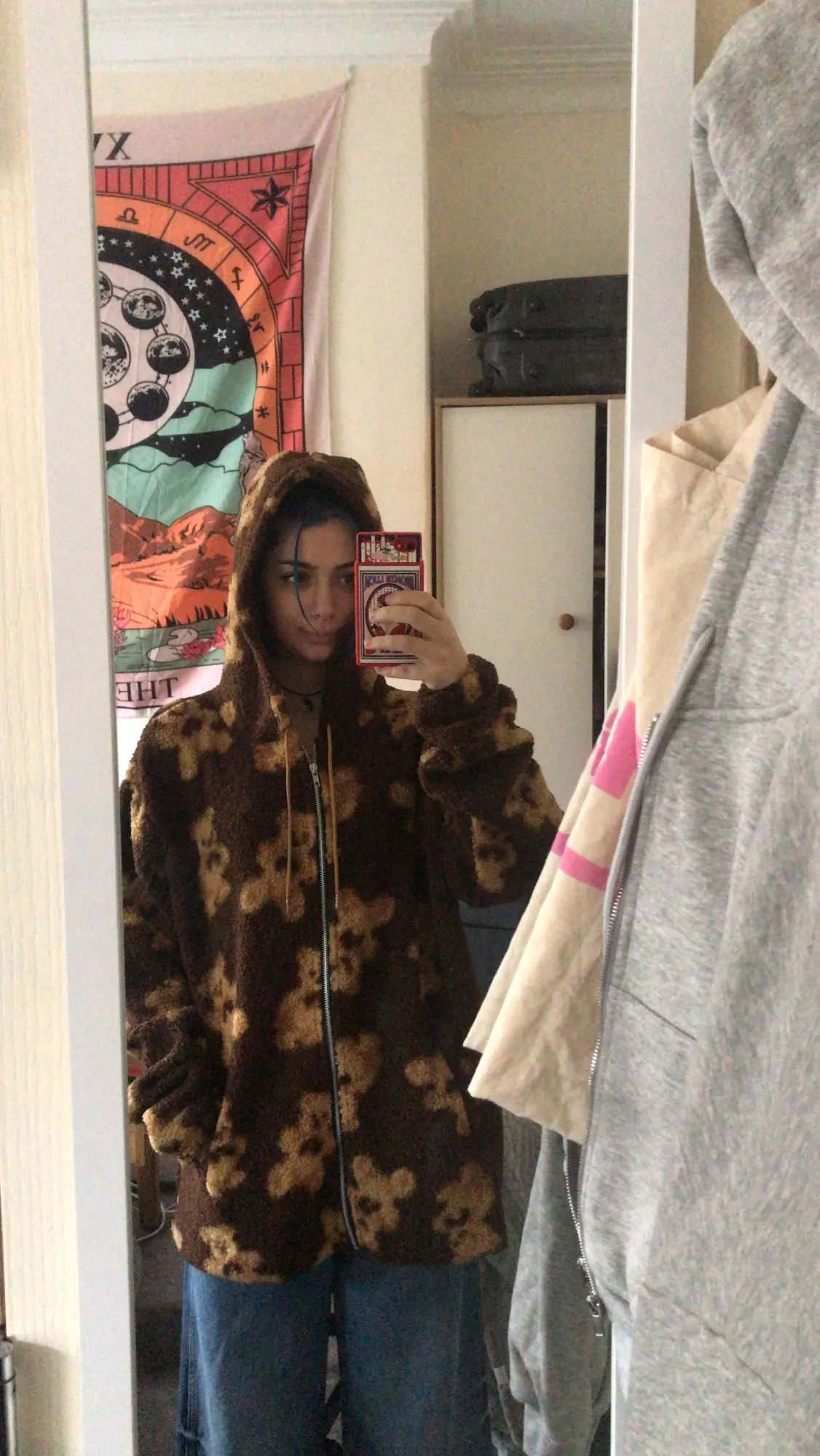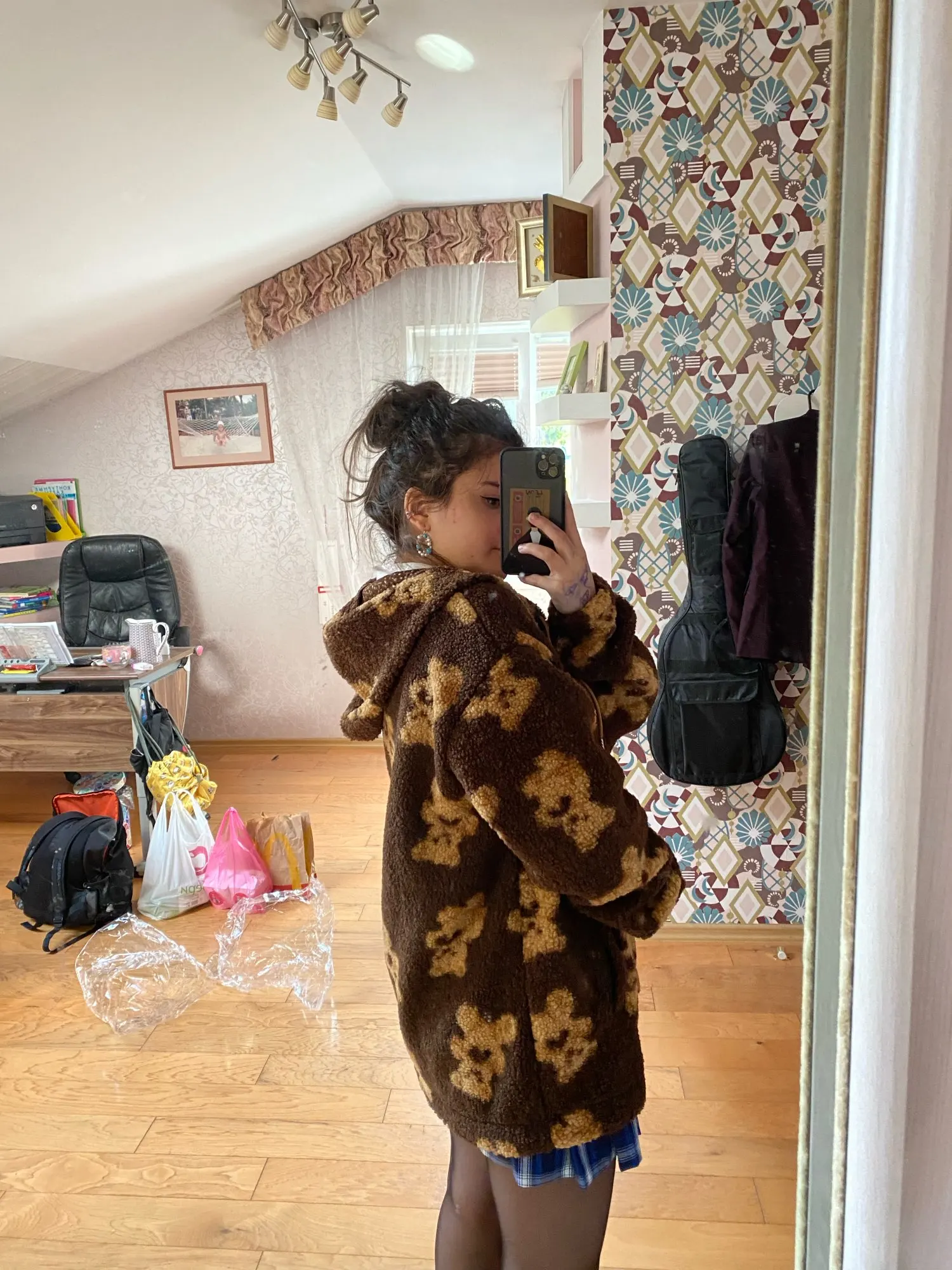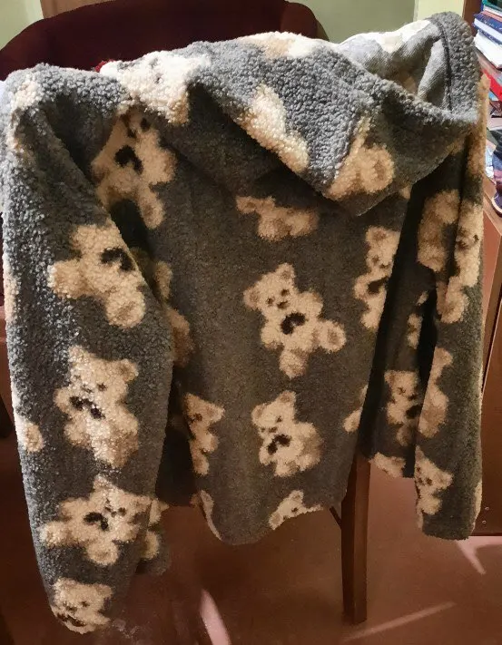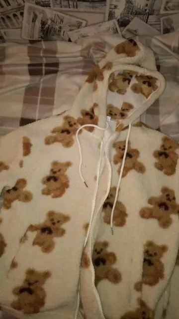 Это так мило! Я думал, что он будет меньше, но он такой большой, он выглядит так хорошо :) мне он очень понравился. Материал как мягкий ковер, он хорошо в длину, но не полностью покрывает попу, рукава длинные, как я хотел. Капюшон тоже хороший, есть шнурки. Карманы, однако, не очень большие, но нормальные.