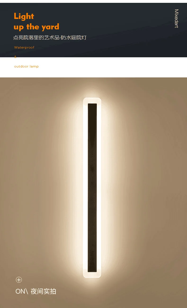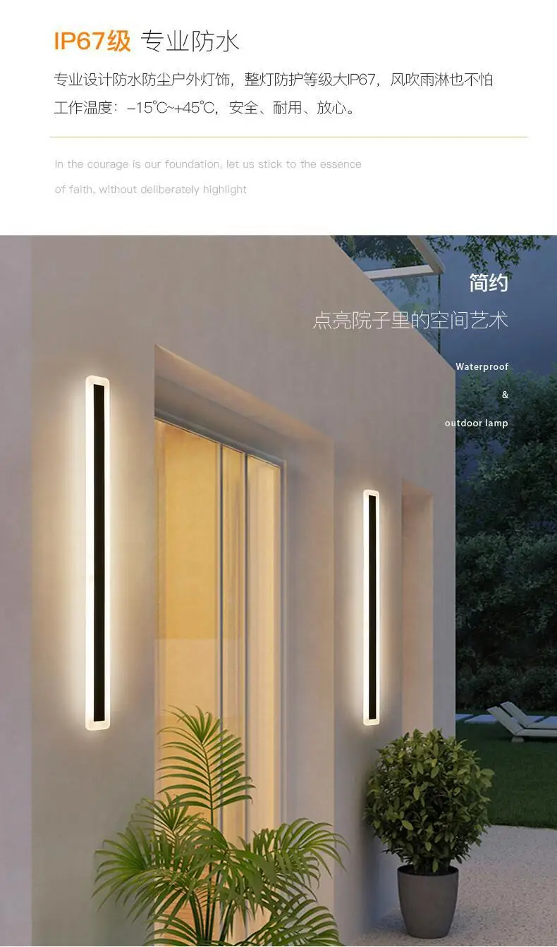 Светодиодный настенный светильник, длинный настенный светильник, открытый, современный, водонепроницаемый, IP65, садовый настенный светильник для крыльца и спальни, прикроватный декоративный светильник, алюминиевая лампа 1. Светильник ing Источник света: светодиодная лампа 2. Светильник: теплый белый, холодный белый 3. Цвета: черный 4. Напряжение: AC85-265V 5. Люмен: 350 лм 6. Гарантия: 3 года 7. (Чип на плате) Срок службы:> 50000 часов 8. IP65, Водонепроницаемый Размеры Параметры: 30*5*5 см: 9 Вт 60*5,5 см: 19 Вт 80*5,5 см: 24 Вт 100*5,5 см: 30 Вт