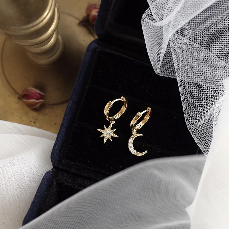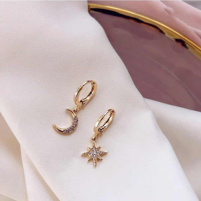Женские серьги со звездой и луной, Классические асимметричные серьг...