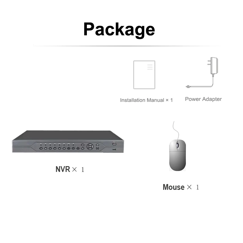 16CH POE NVR x 1 + мышь x 1 + адаптер x 1 + руководство по установке x 1