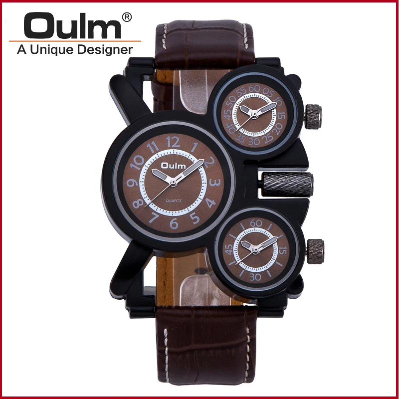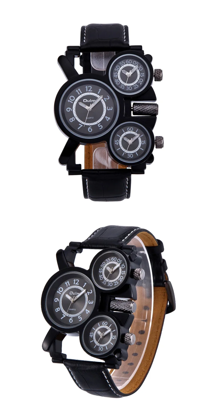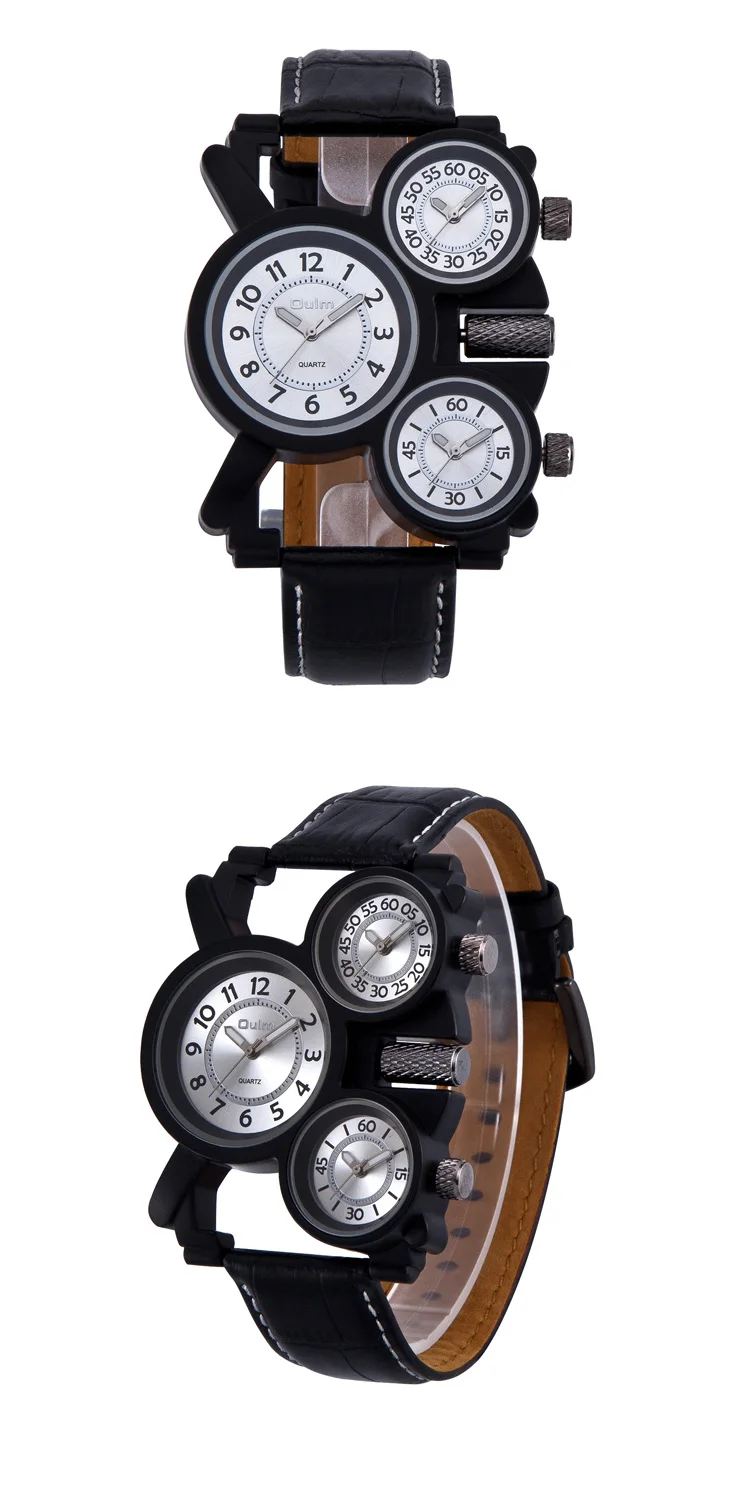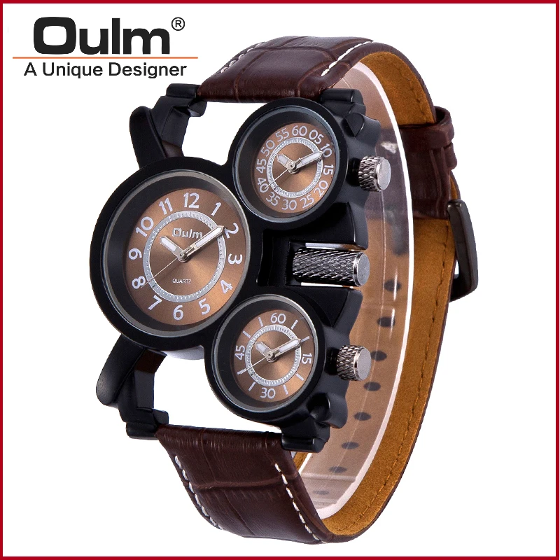 OULM 1167 Мужские Винтажные кварцевые часы в стиле стимпанк с кожаным ремешком, 3 часовых пояса, япония MOVT, повседневные