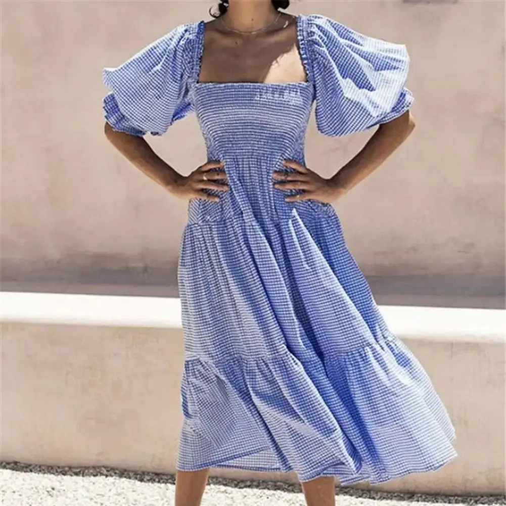 Женское плиссированное платье миди с пышными рукавами, повседневное элегантное винтажное платье с широким подолом, открытыми плечами и оборками для пляжа, на лето