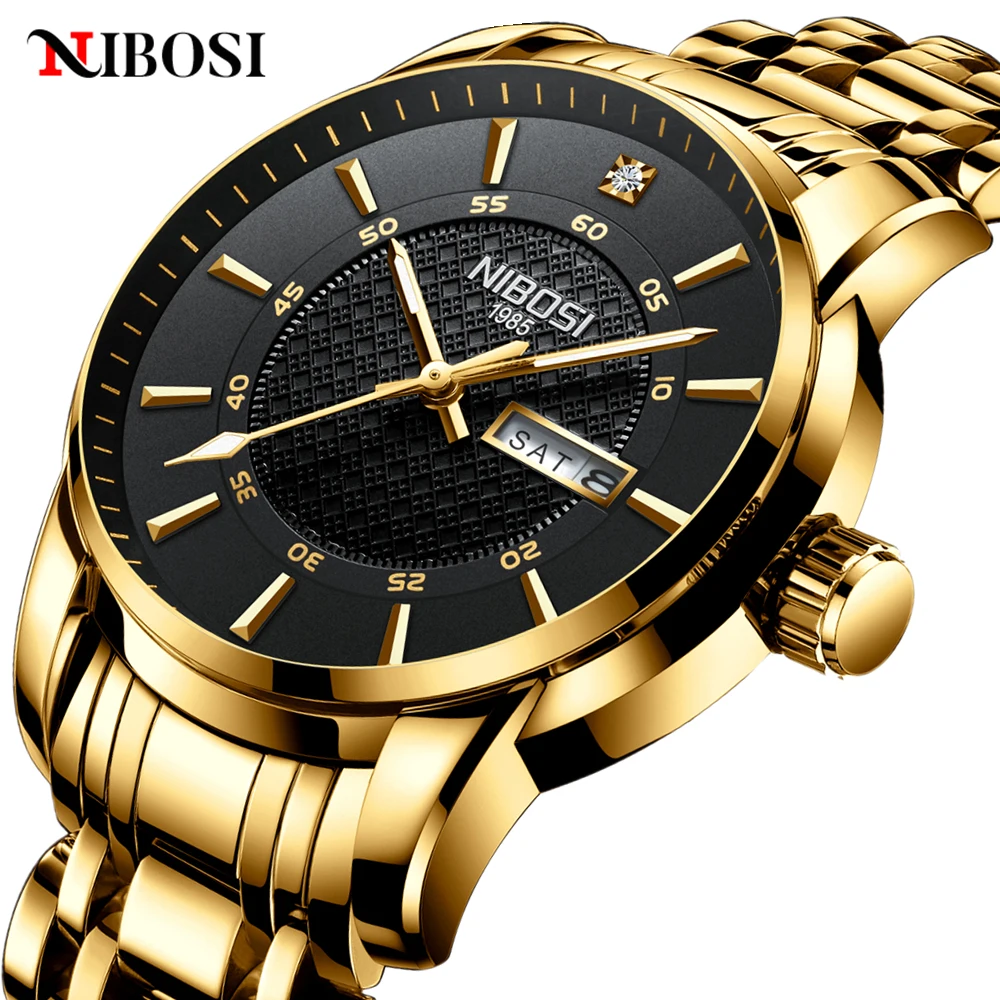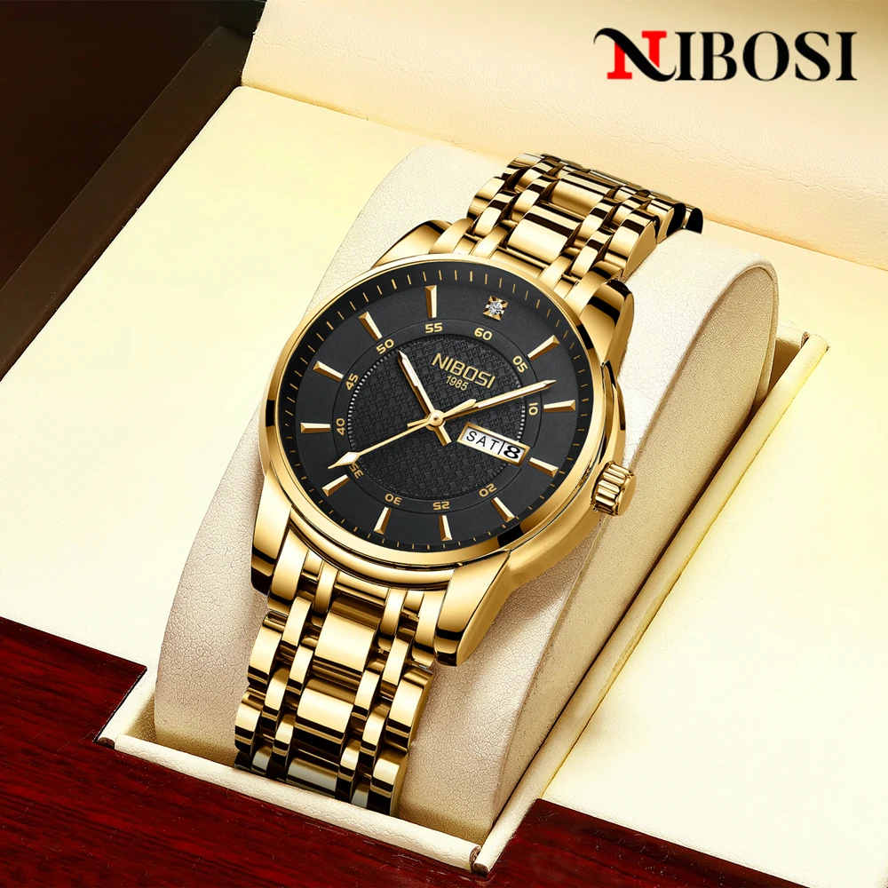 Часы наручные NIBOSI Мужские кварцевые, брендовые Роскошные водонепроницаемые стальные, с долгим сроком службы, золотистые чёрные