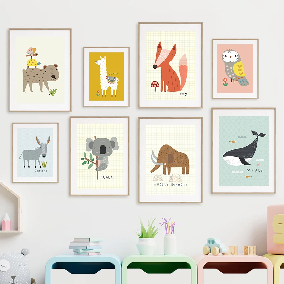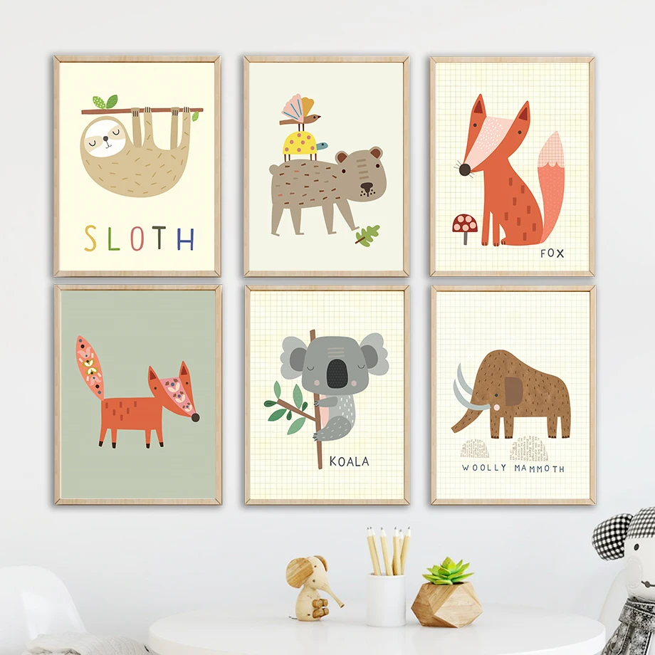 Милые животные в джунглях, лиса, коала, осел, Ленивец, Сова, скандинавские плакаты и принты, настенная Картина на холсте, настенные картины, декор для детской комнаты