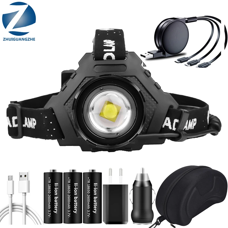 SXHP100 самый мощный светодиодный налобный фонарь, налобный фонарь с регулировкой луча, внешний аккумулятор 7800 мАч, аккумулятор 18650