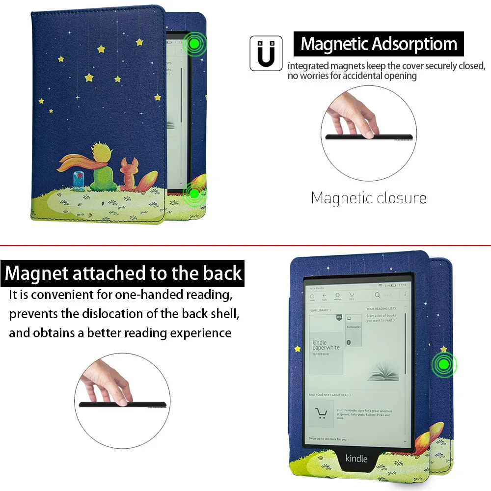 1. Точное положение отверстия, идеально подходит для спецификации продукта и места зарядки.2. Открывается как книга, автоматически пробуждая Kindle paperwhite, когда открывается и кладет его в Сон при закрытии.3. Тонкий и ультра легкий. Изготовлен из высококачественной противоскользящей искусственной кожи и с нескользящей микрофиброй.4. Интегрированный магнит сильно впитывает и надежно закрывает устройство и не беспокоится о случайном открытии.