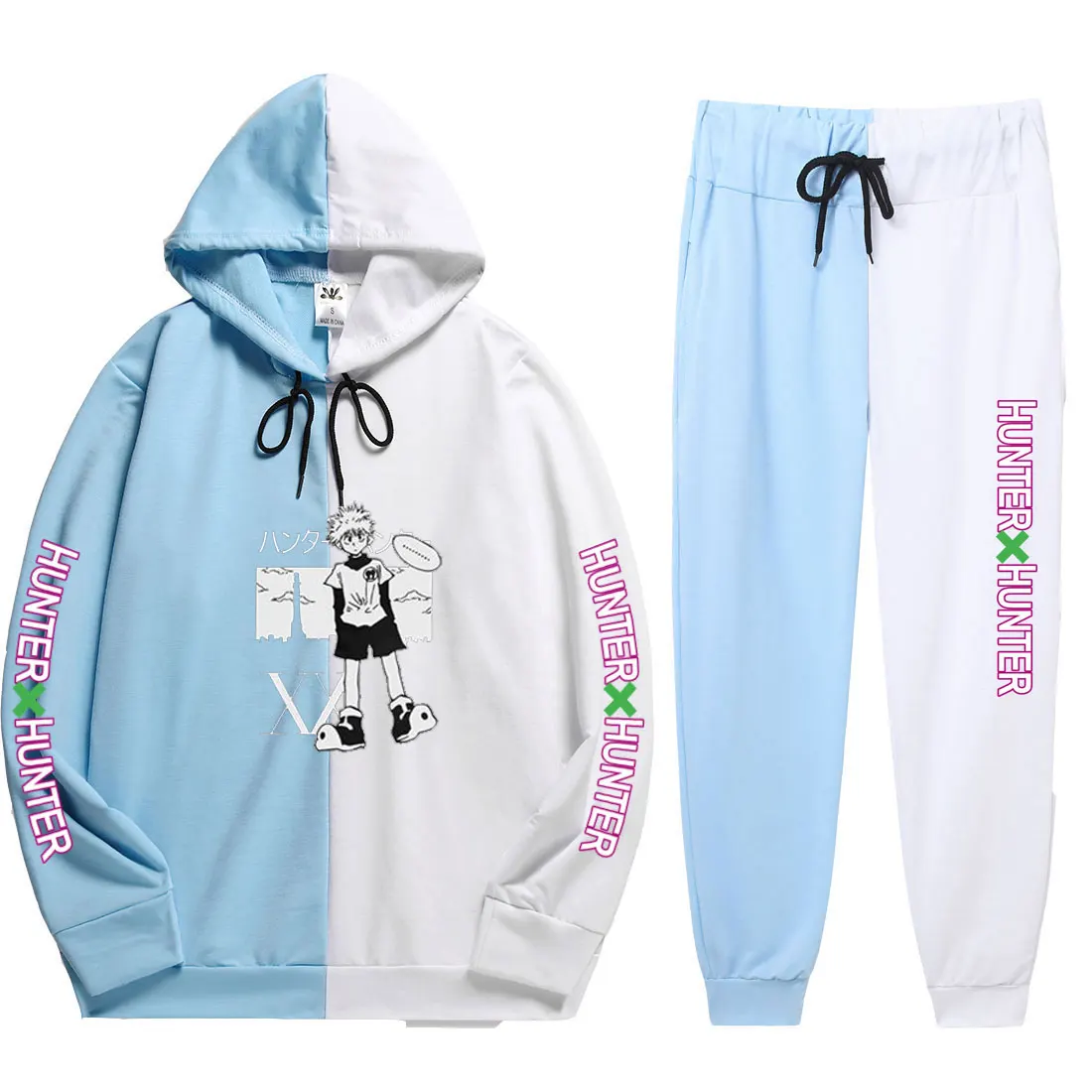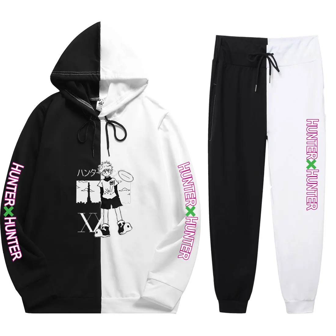 Уличный комплект унисекс из 2 предметов 2021, летняя повседневная крутая тонкая толстовка с капюшоном и брюки в стиле пэчворк с принтом Hunter X Hunter