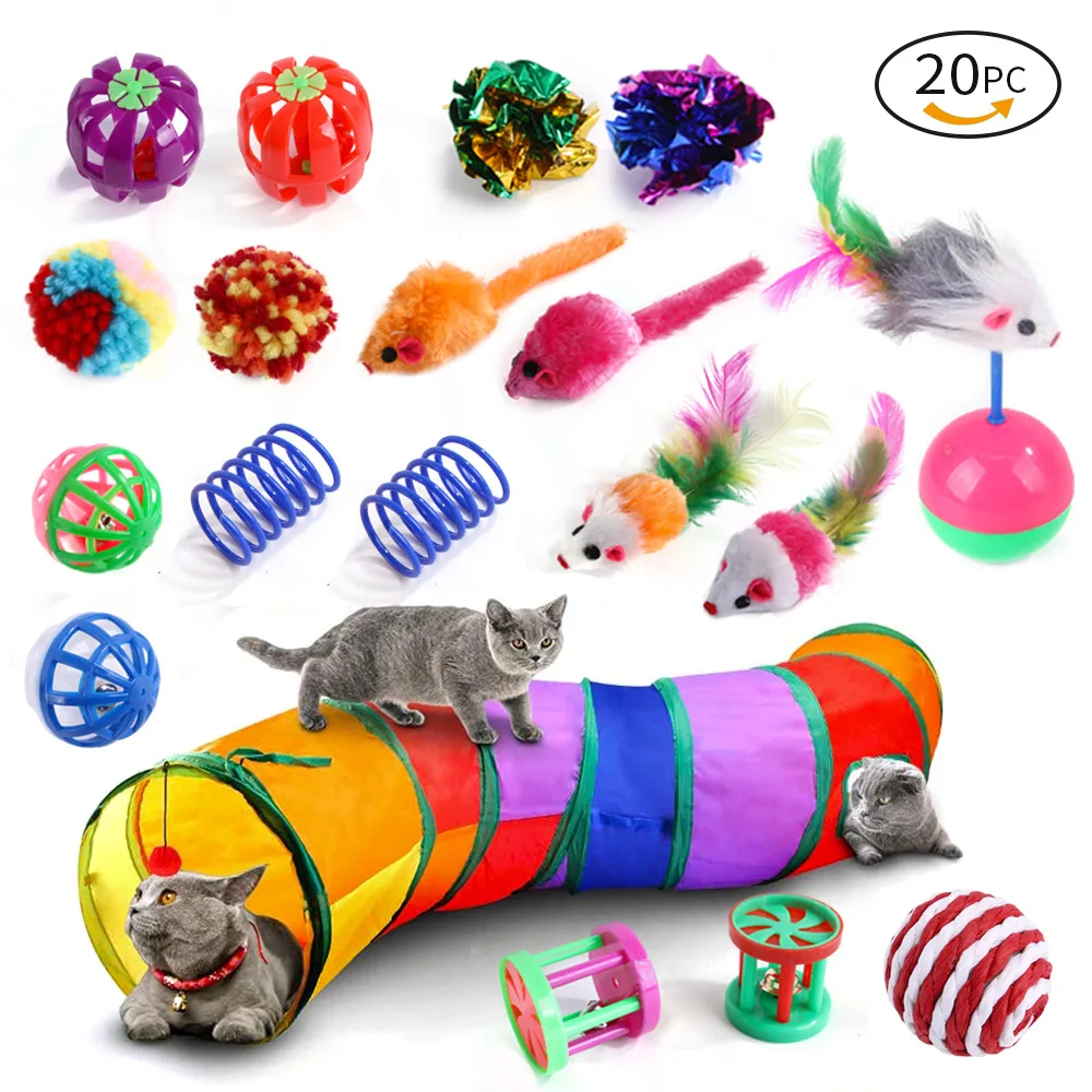 20 игрушки для котов котенок игрушки ассортимент, 1 туннель для кошек кошка пижамы для малыша Дразнилка перо, Интерактивная палочка игрушка с перьями пушистые Мышь морщинка шарики