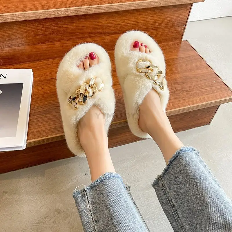 Меховые сланцы, плюшевые шлепанцы с золотой цепочкой, дизайнерские ...