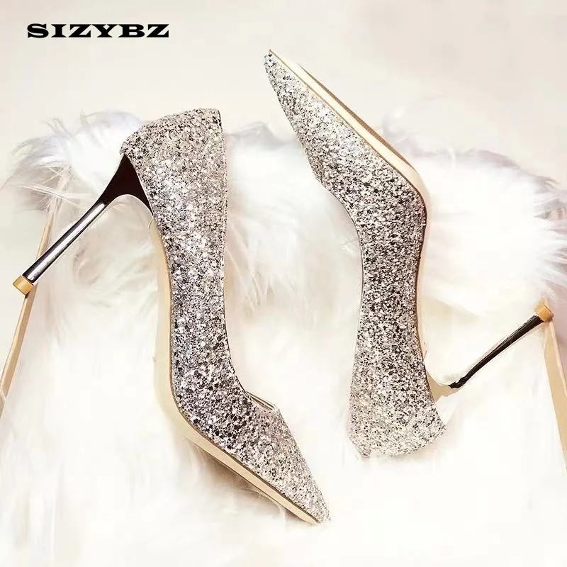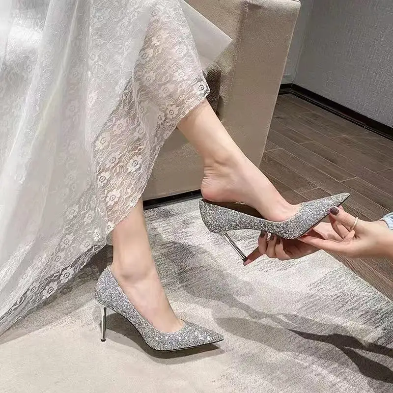 Туфли-лодочки женские свадебные, заостренный носок, высокий каблук-шпилька, хрустальные, серебристые туфли-лодочки для подружки невесты с блестками