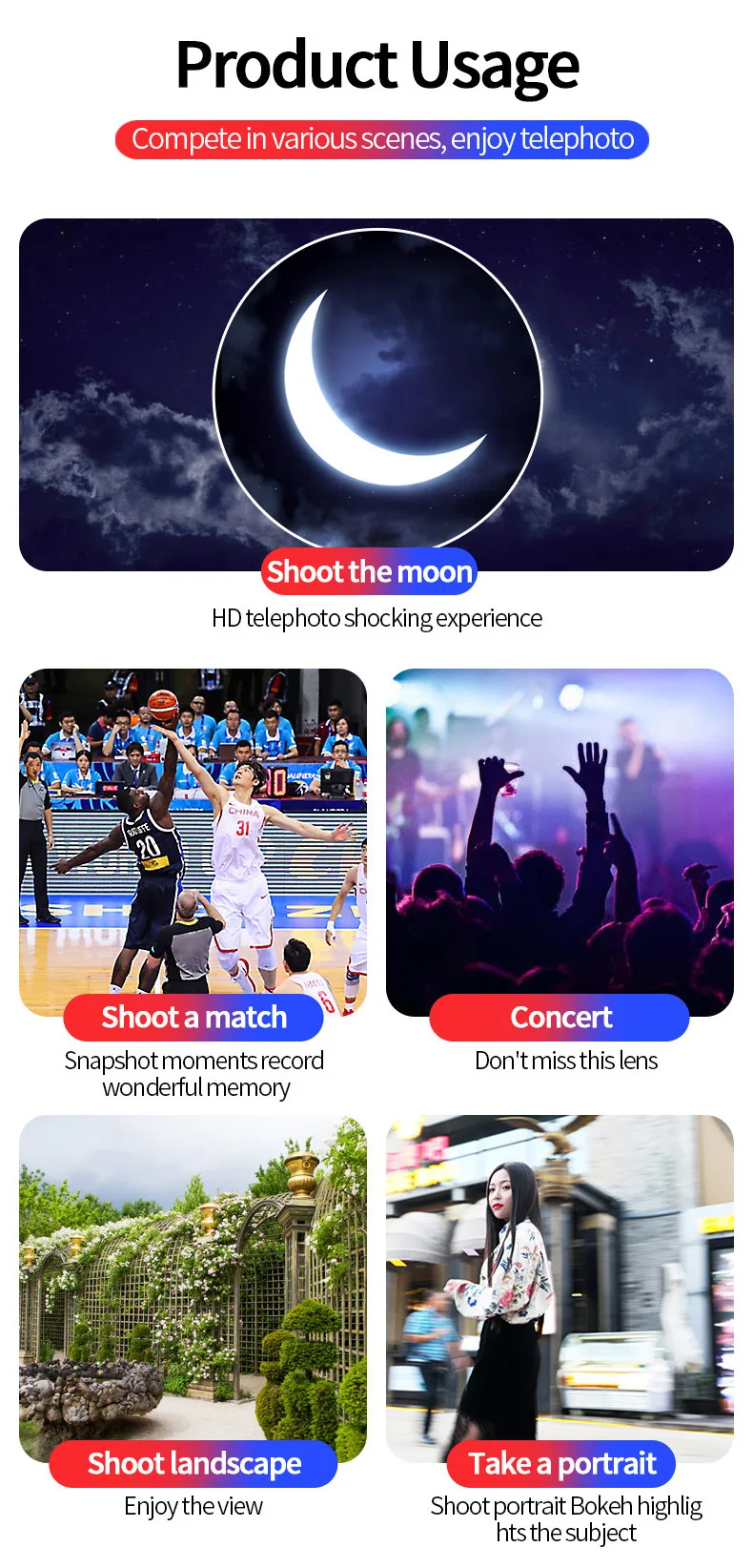 Временное увеличение, позволяющее хорошо регулировать фокусное расстояние. Телескоп можно использовать как монокуляр. Подходит для большинства мобильных телефонов, включая флип-телефоны и барные телефоны, телефон имеет заднюю камеру, может быть подключен к телескопу через зажим. Мобильный телефон качество изображения может быть улучшено. Подходит для просмотра игр, концертов, туризма, наблюдения за животными, съемки на дальних расстояниях новостных репортеров и т. д. частный детектив, фотографирующий криминалистику, геологические исследования, управление лесным хозяйством, планирование железнодорожного порта и т. д.