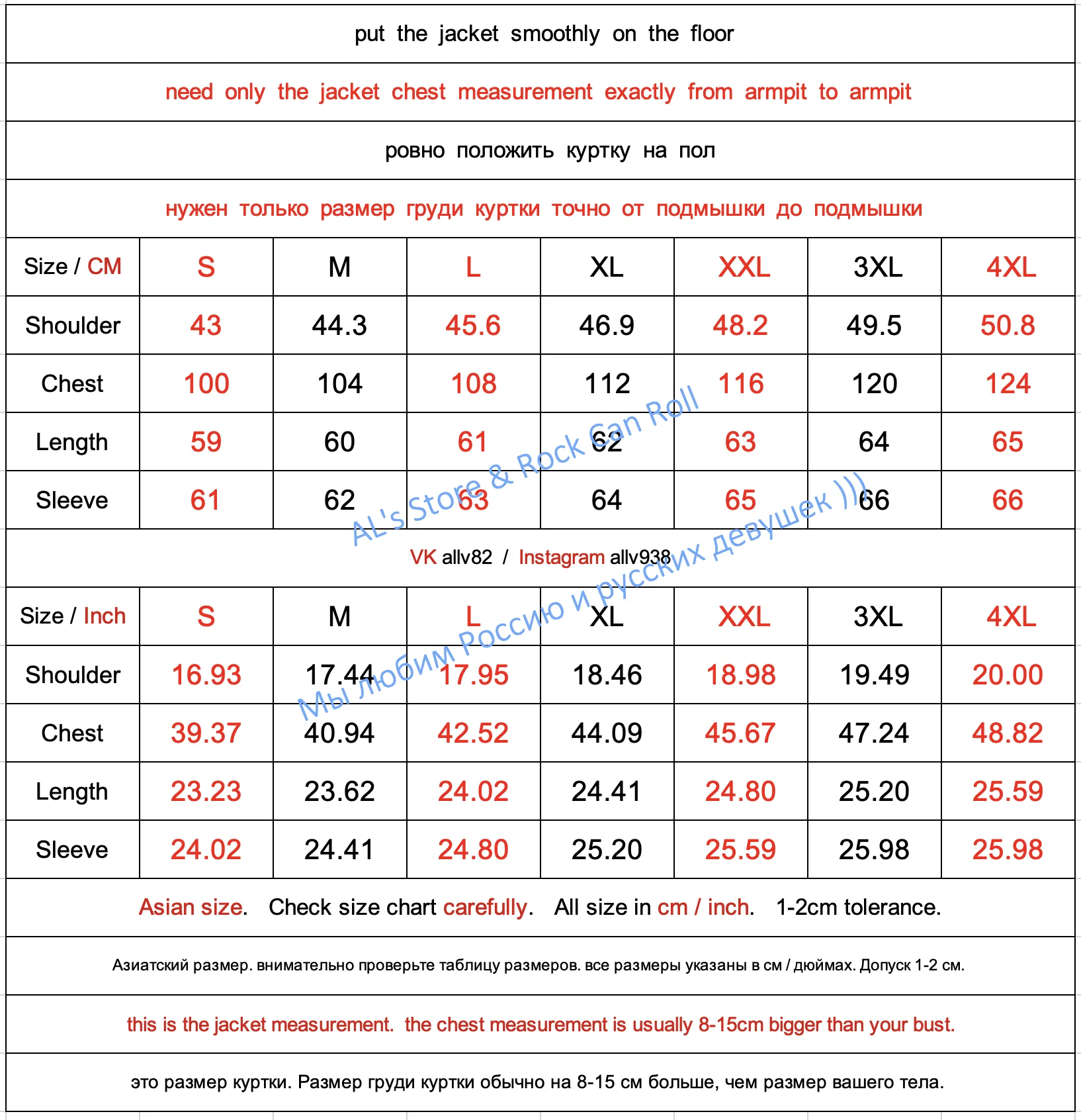 Пожалуйста, проверьте таблицу размеров и измерьте вашу куртку, как показано ниже.