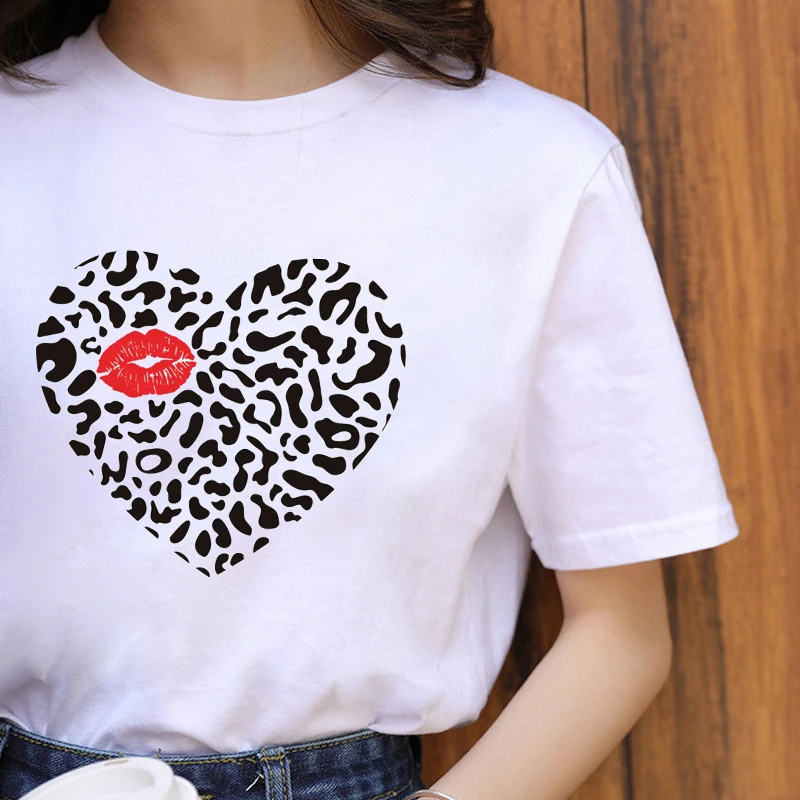 Футболка женская из чистого хлопка, с леопардовым принтом в виде губ, большого размера, с круглым вырезом, 2012