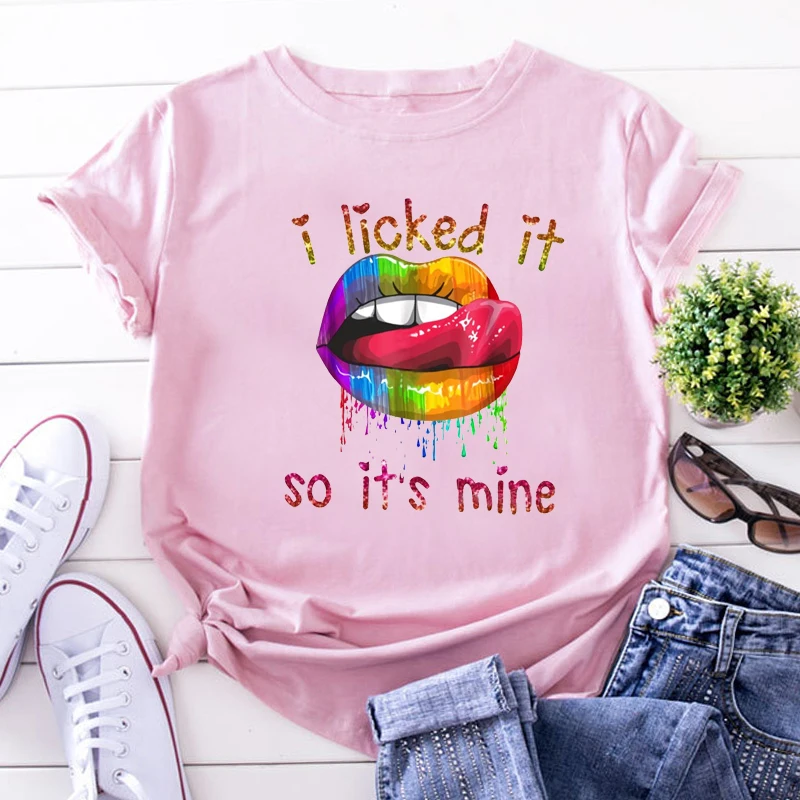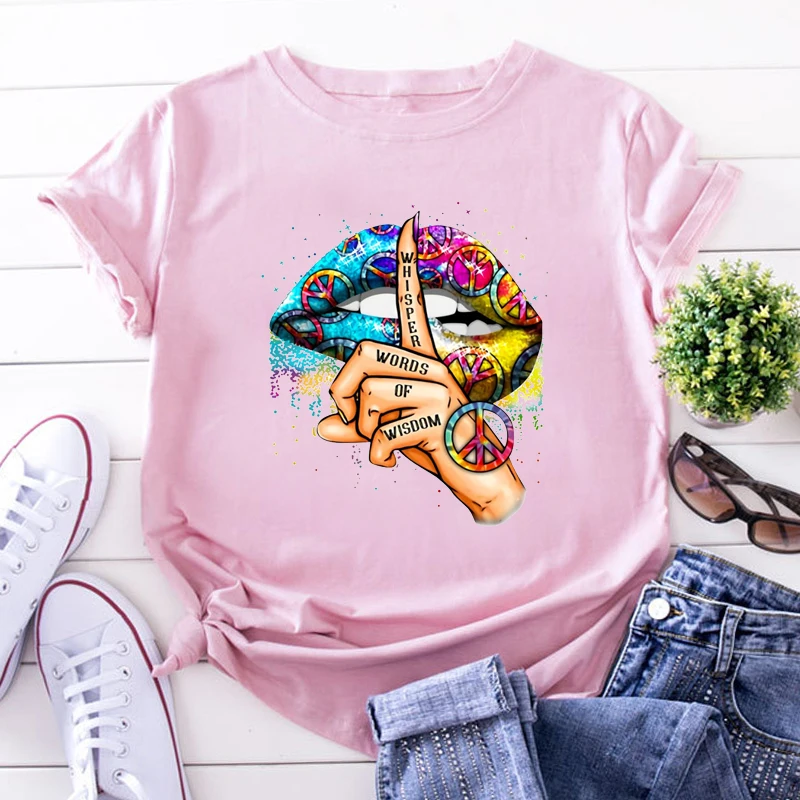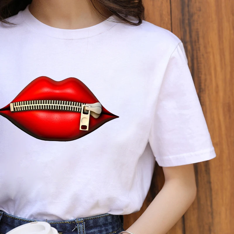 Женская футболка с коротким рукавом, принтом губ и круглым вырезом