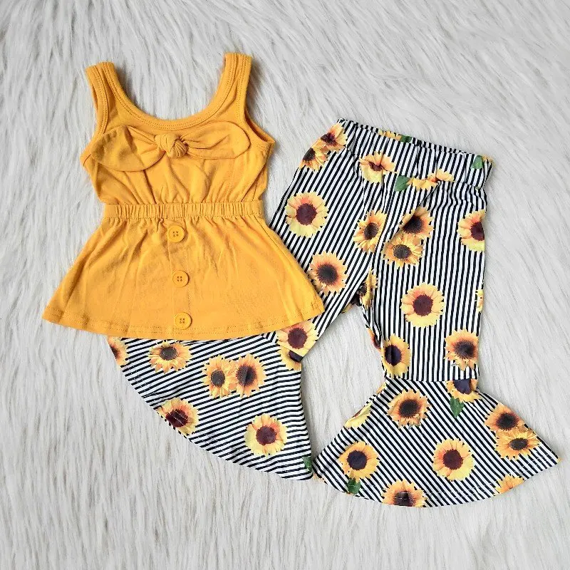 Оптовая продажа, одежда для маленьких девочек с изображением фермерской фермы, рубашка с короткими рукавами и желтыми завязками, брюки с рисунком курицы и колокольчика, Детский комплект