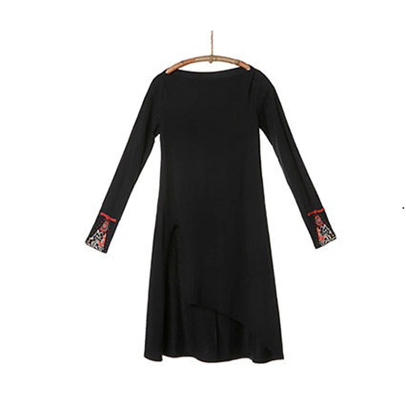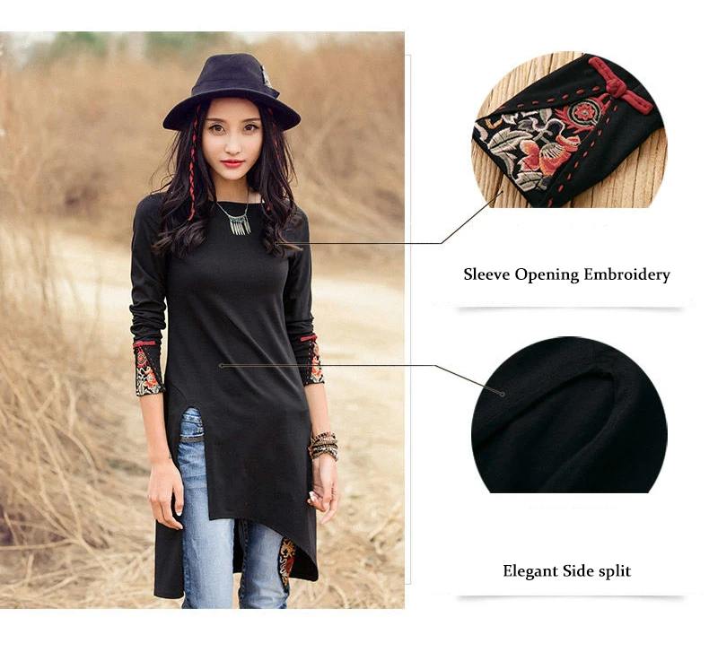 Женская футболка с вышивкой, Длинная черная Винтажная футболка с Боковым Разрезом, осень 2021