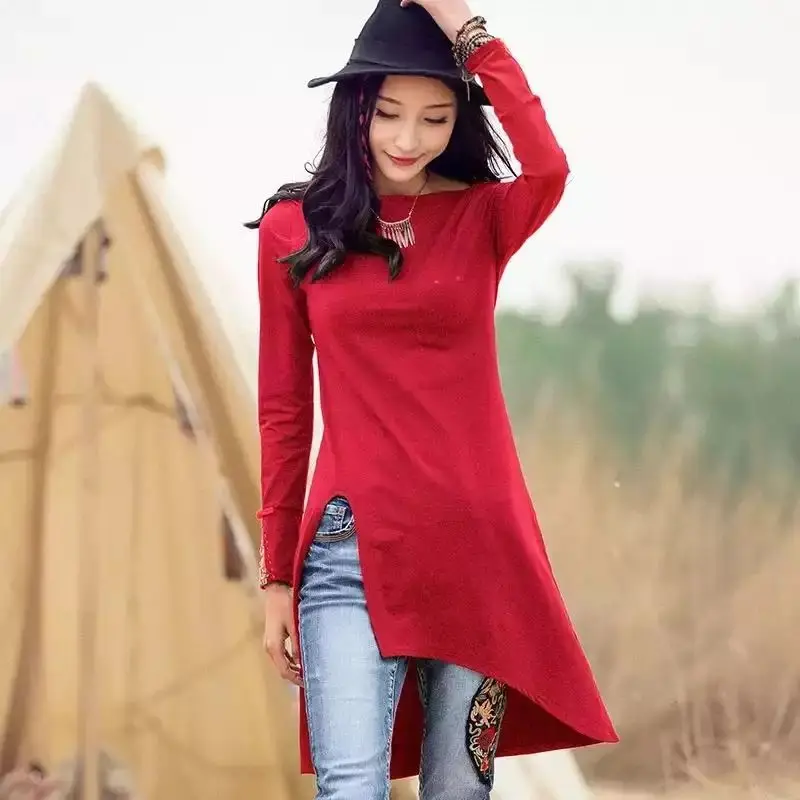 Женская длинная футболка с вышивкой в этническом стиле, Элегантная ...