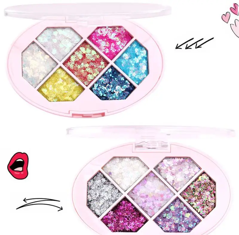 Палетка теней для век, 6 цветов, с большими блестками, водостойкая,...