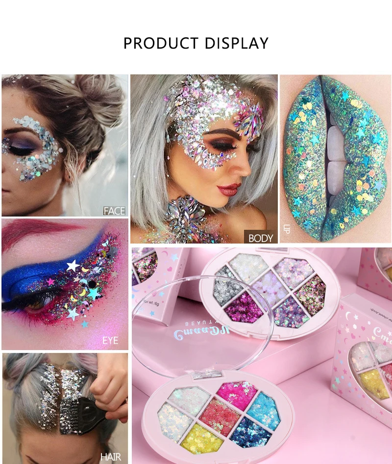 1. Ослепительная и великолепная: палитра теней с блестками очень Ослепительная и великолепная. Массивные сверкающие маленькие звезды, Луны, шестиугольники и пыль излучают неотразимый светильник, выводя их на новый уровень. Наша палитра теней с блестками изготовлена из дизайнерских формул, высокопрочных пигментов и голографического блеска. Есть 7 цветов, которые очень подходят для подарков и блестящих эффектов.