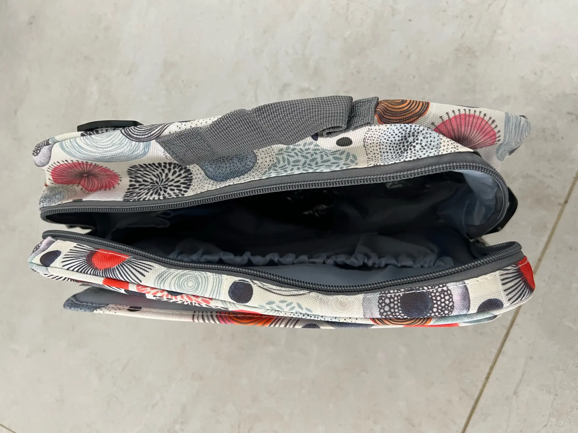 Прийшла до Києва за 21 день на Міст експрес. Гарної якості пошиття та фурнітура. В середині приємно вразив карман для пляшечки зроблений як термо, обшитий фольгою. В комплекті довгий ремінець на плече та два крючки з липучками щоб вішати на коляску. Рекомендую товар та продавця.