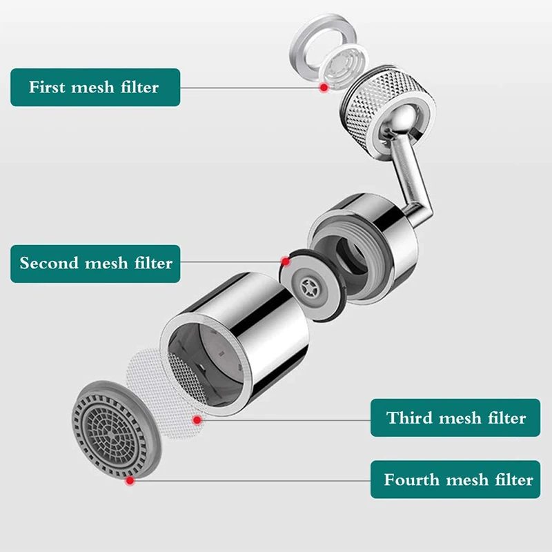 2. Два вида роторных переключателей для выхода воды, кислородная пена, защита от брызг воды, Четырехслойный сетчатый фильтр для удаления примесей и двойные прокладки для предотвращения капель.