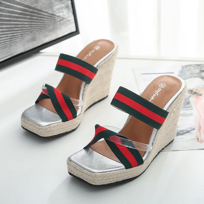 Женские пляжные шлепанцы на танкетке, плетеные сандалии из пеньковой веревки, пляжные тапочки на платформе, черные, серебристые, размеры 45, 46, на лето