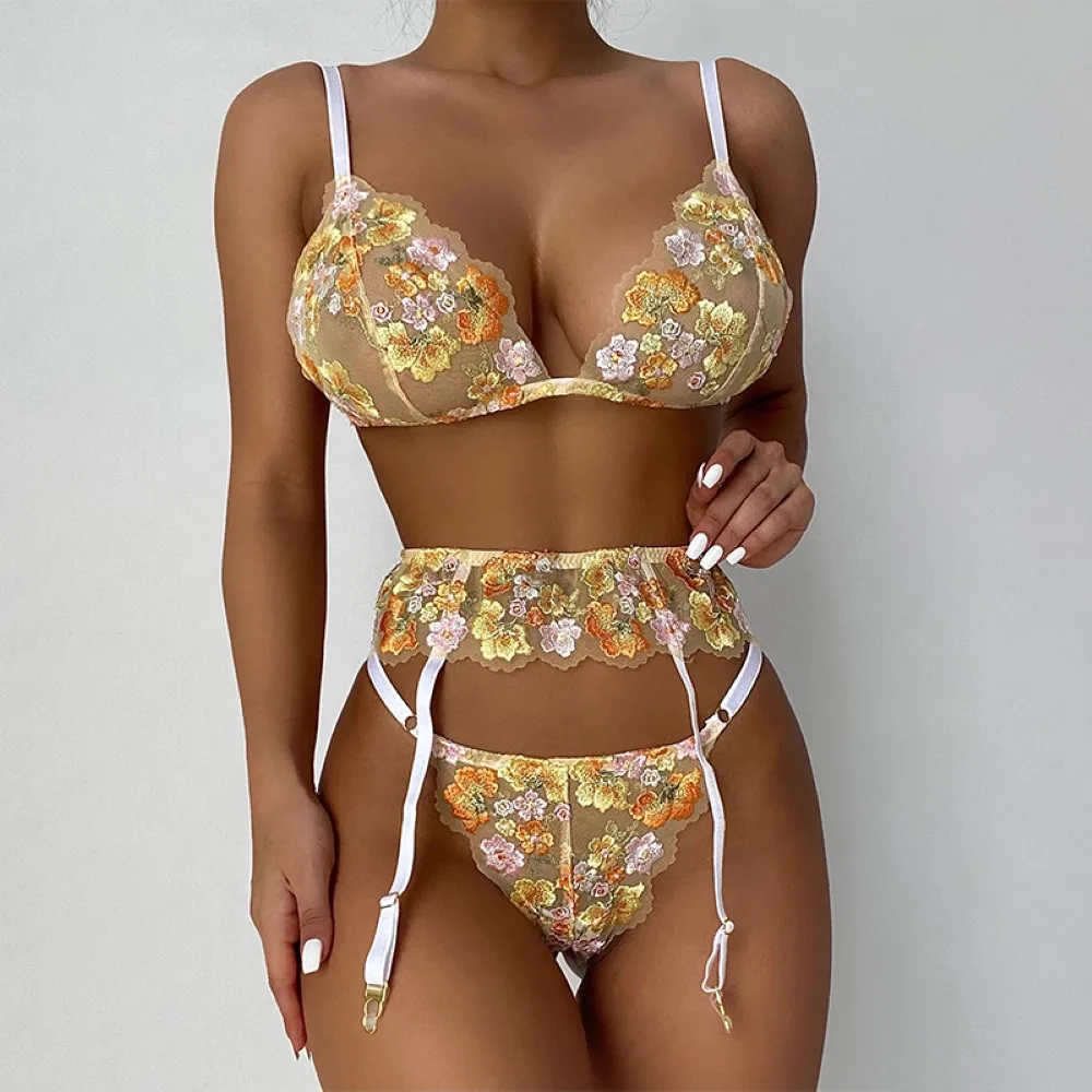 Новое сексуальное нижнее белье с цветочной вышивкой, комплект нижнего белья из 3 предметов, чувственное женское нижнее белье, кружевное белье, подвязки, бюстгальтер и стринги