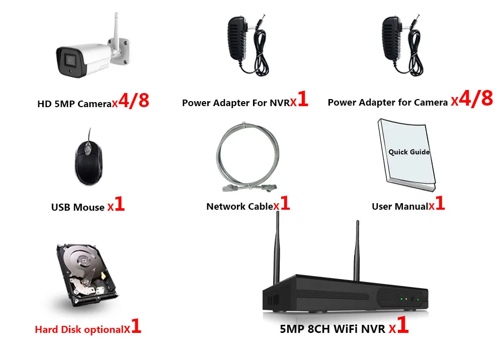 1x 8CH 5MP Беспроводной NVR 4/8x пулевые камеры 4/8x источник питания для камеры 1x источник питания для NVR 1x USB мышь (подарок) 1x 3 фута 1 м Ethernet кабель (подарок) 1x быстрая направляющая