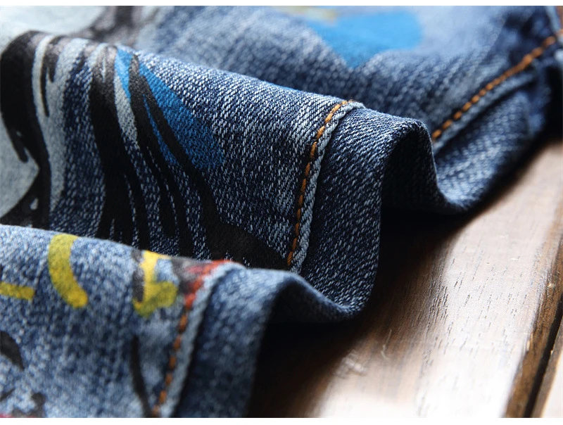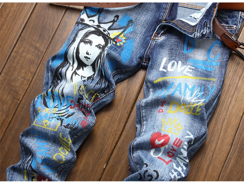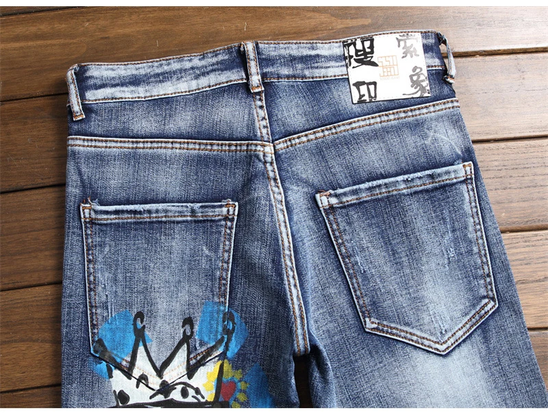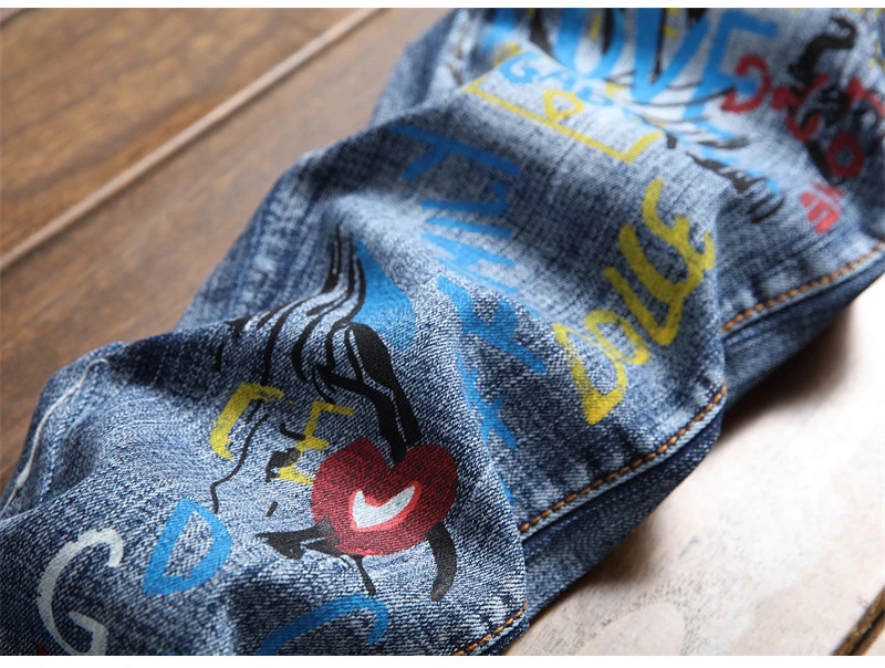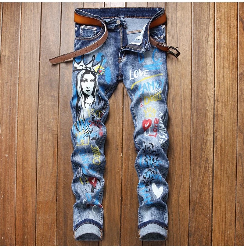 Джинсы мужские с рисунком, Модные приталенные прямые Стрейчевые брю...