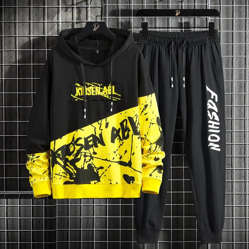Корейский модный спортивный с напечатанной надписью в стиле хип-хоп, из кусков, мужские толстовки с капюшоном, Комплекты Одежда для улицы; Одежда для тонкий молодежная мода спортивный костюм комплект из 2 предметов