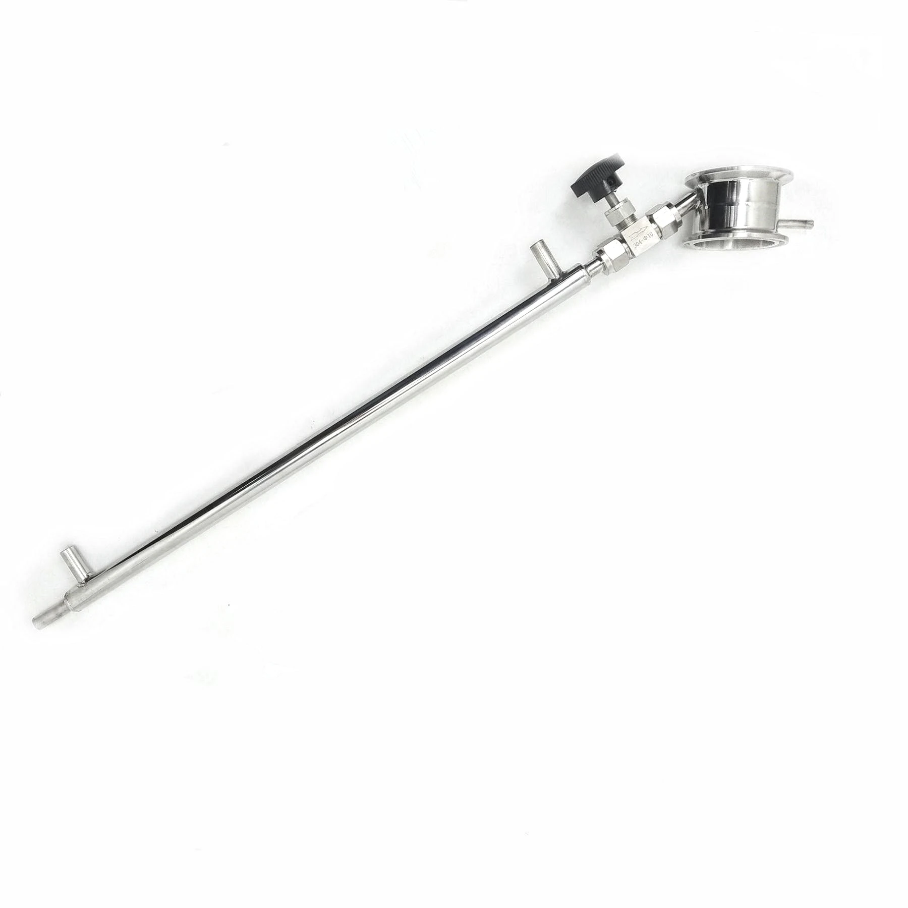 Узел отбора предназначен для отбора флегмы на разных участках колонны, в основном для отбора головной фракции.Предназначен для самогонных аппаратов колонного типа с кламповыми соединениями на 2 дюйма.Оборудован посадочным гнездом для электронного термометра.Используя узел отбора в колонне можно отобрать "головы", регулируя отбор игольчатым краном.Так же данный узел просто необходим при ректификации, т.к. именно регулированием потока отбираемой жидкости регулируется температура при которой отбирается чистый спирт при ректификации.Узел отбора имеет штуцер под термометр и трубку для выхода флегмы, на которую устанавливлен игольчатый кран для регулировки потока и доохладитель.В данном варианте узла отбора трубка отвода флегмы загнута выполнена под углом 45 градусов, чтобы доохладитель не упирался в крышку перегонного куба, ввиду большой длины доохладителя.