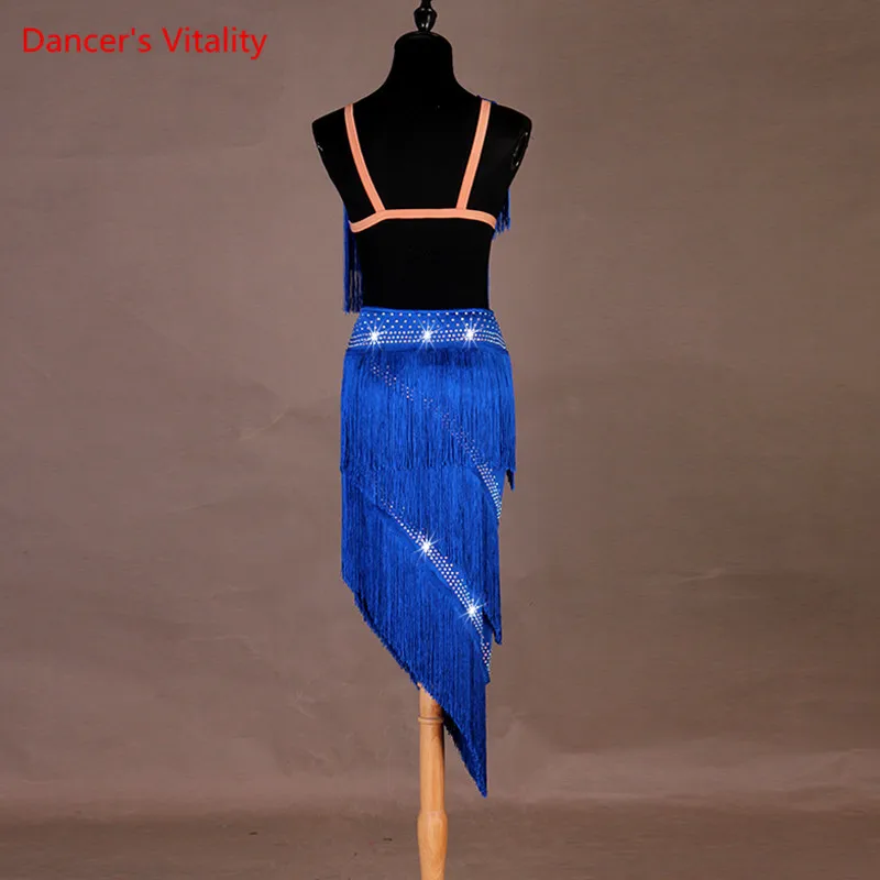 Женские ботильоны из замшевой кожи, платье для танцев костюмы для латиноамериканских танцев девочек Румба ча-юбка Cha бального танца Конкурс костюмы костюм для танцев; Со стразами; С бахромой платье