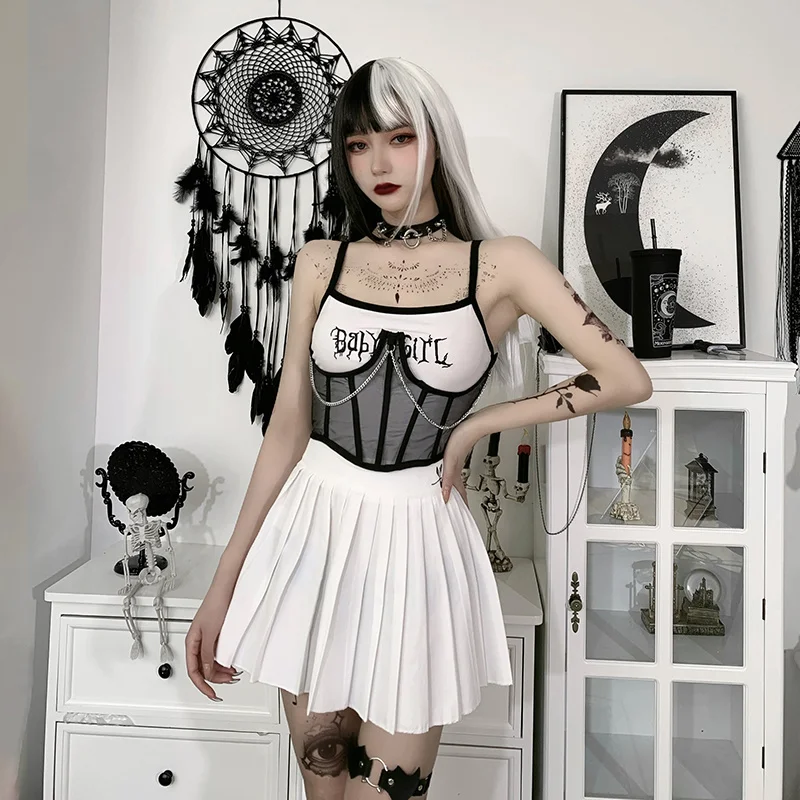 Черный корсет с металлической цепочкой в стиле панк, готические корсеты с высокой талией Harajuku, винтажные сетчатые прозрачные корсеты для талии