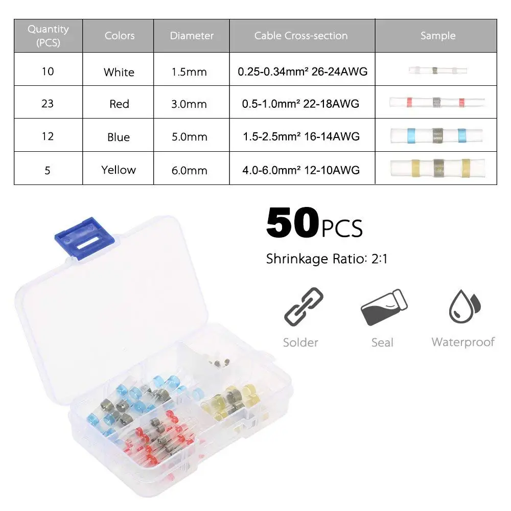 Термоусадочные стыковые обжимные клеммы, 50 шт., водонепроницаемые уплотнители для припоя, электрические разъемы, комплект для сращивания проводов, автомобильных и морских кабелей