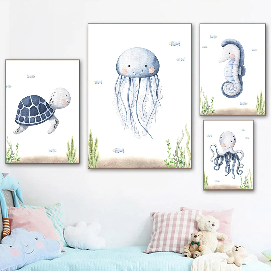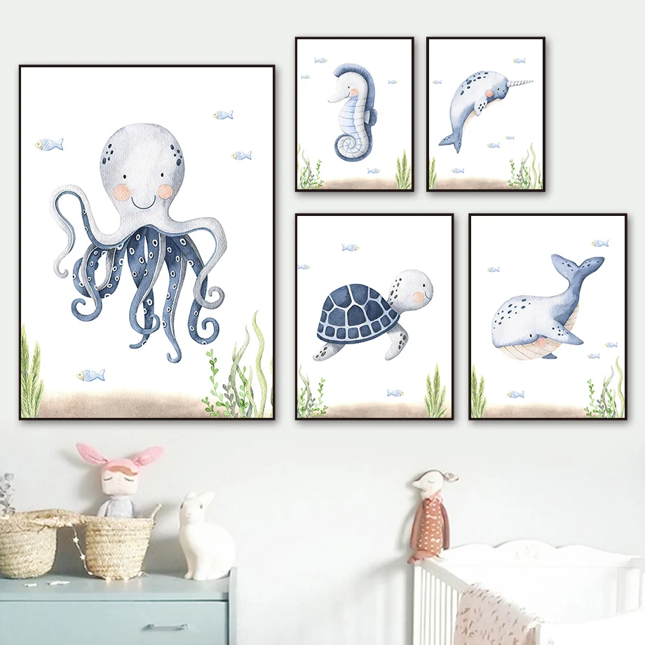 Милые морские животные, Кит, черепаха, мультфильм, настенная Картин...