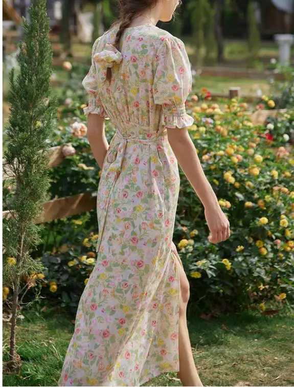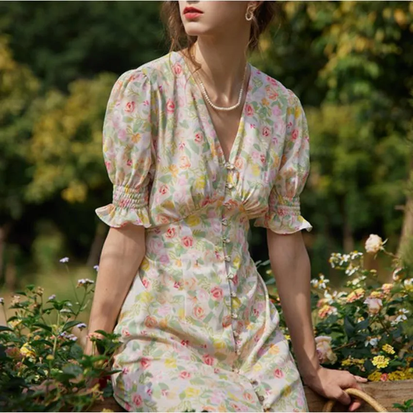 Женские летние облегающие платья Бохо с цветочным принтом, винтажное пляжное платье с пышными рукавами и V-образным вырезом