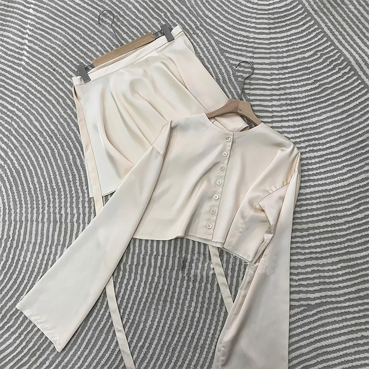 Комплект из двух предметов женский атласный, элегантный укороченный топ с длинными рукавами-фонариками, пикантная ТЕННИСНАЯ СПОРТИВНАЯ мини-юбка с завышенной талией, белый комплект из 2 предметов, 2021